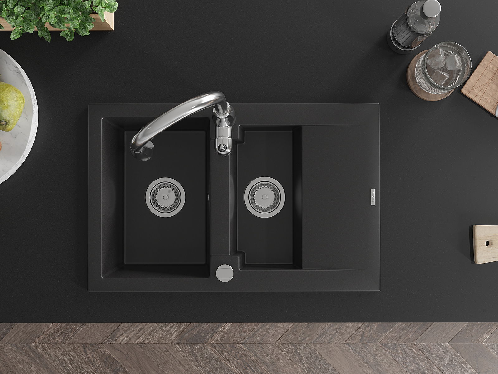 Mexen Gaspar гранитна мивка 1,5-коморов с отцедник и кухненски смесител Savita, черен - 6507-77-672601-00
