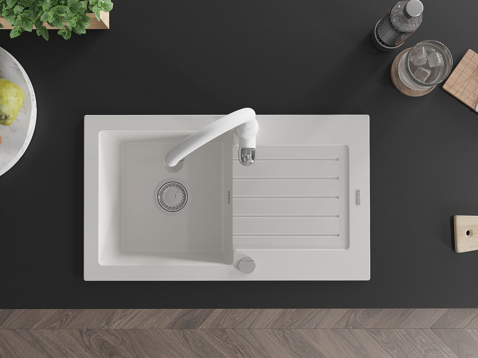 Mexen Pablo гранитна мивка с 1 отделение с отцедник и кухненски смесител Savita, бял - 6510-20-672601-20