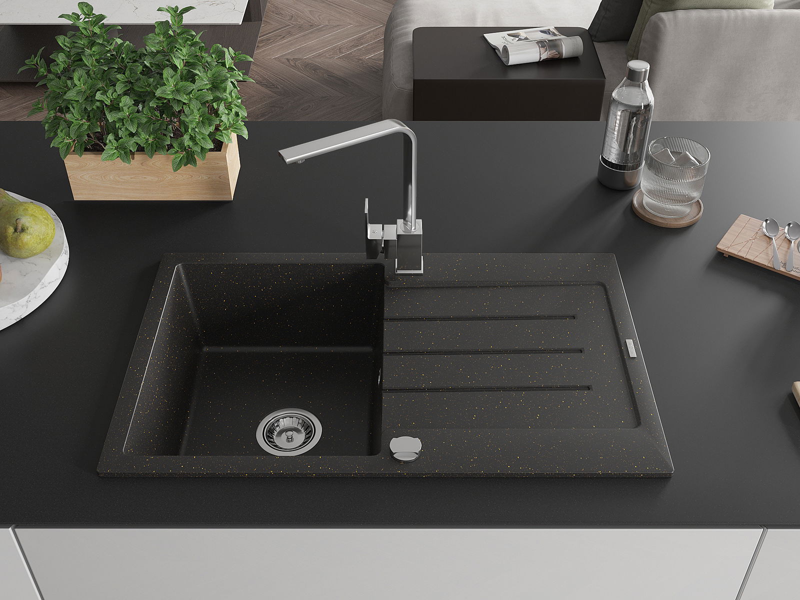 Mexen Bruno гранитна кухненска мивка с 1 отделение с отцедник и кухненски смесител Rita, черен/златист металик - 6513-75-670300?