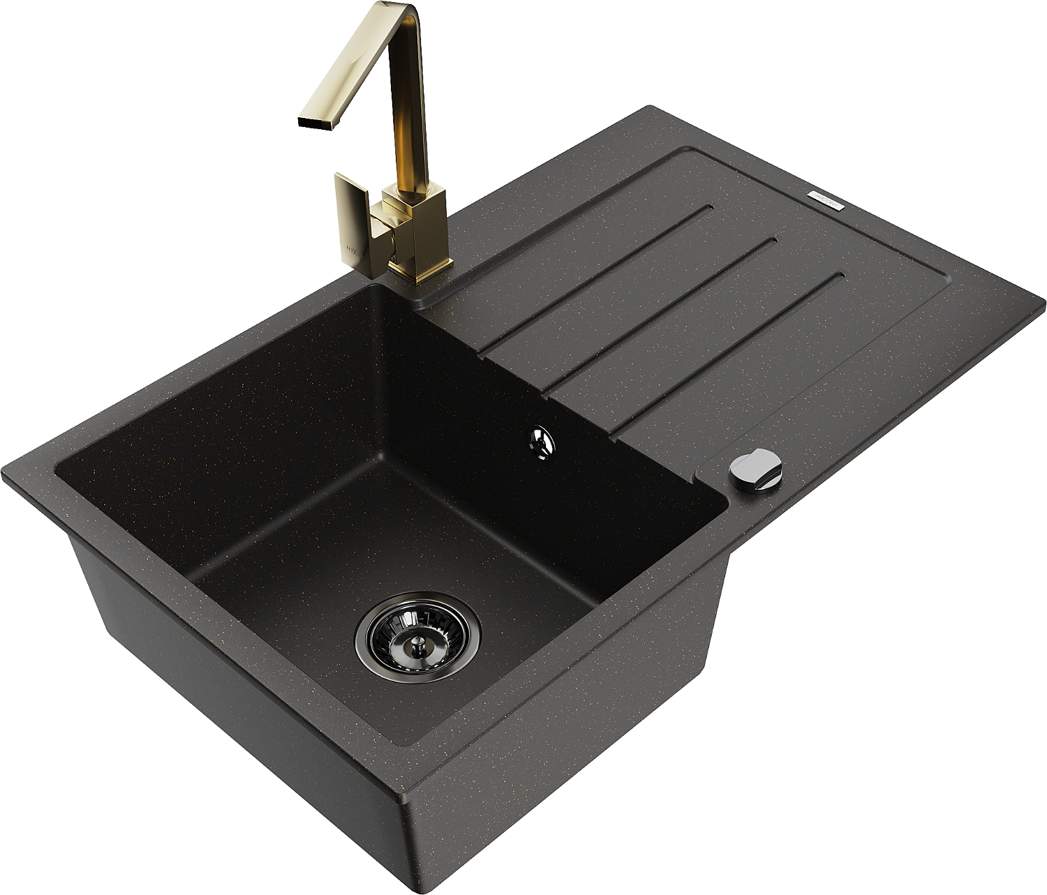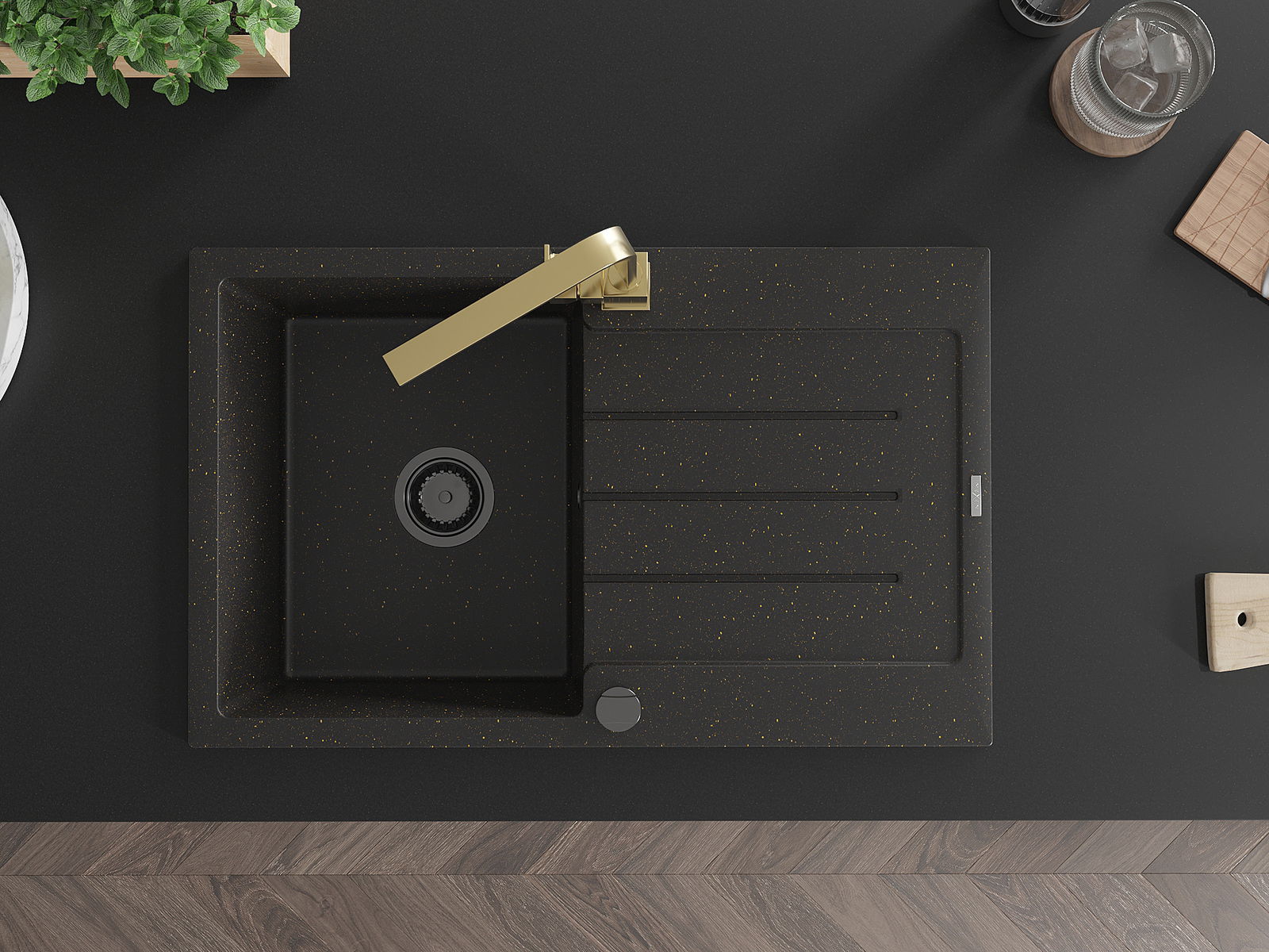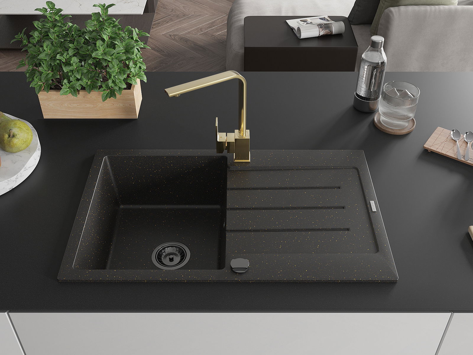Mexen Bruno гранитна мивка с 1 камера и отцедник, с кухненски смесител Rita, черен/златист металик - 6513-75-670300-50-B