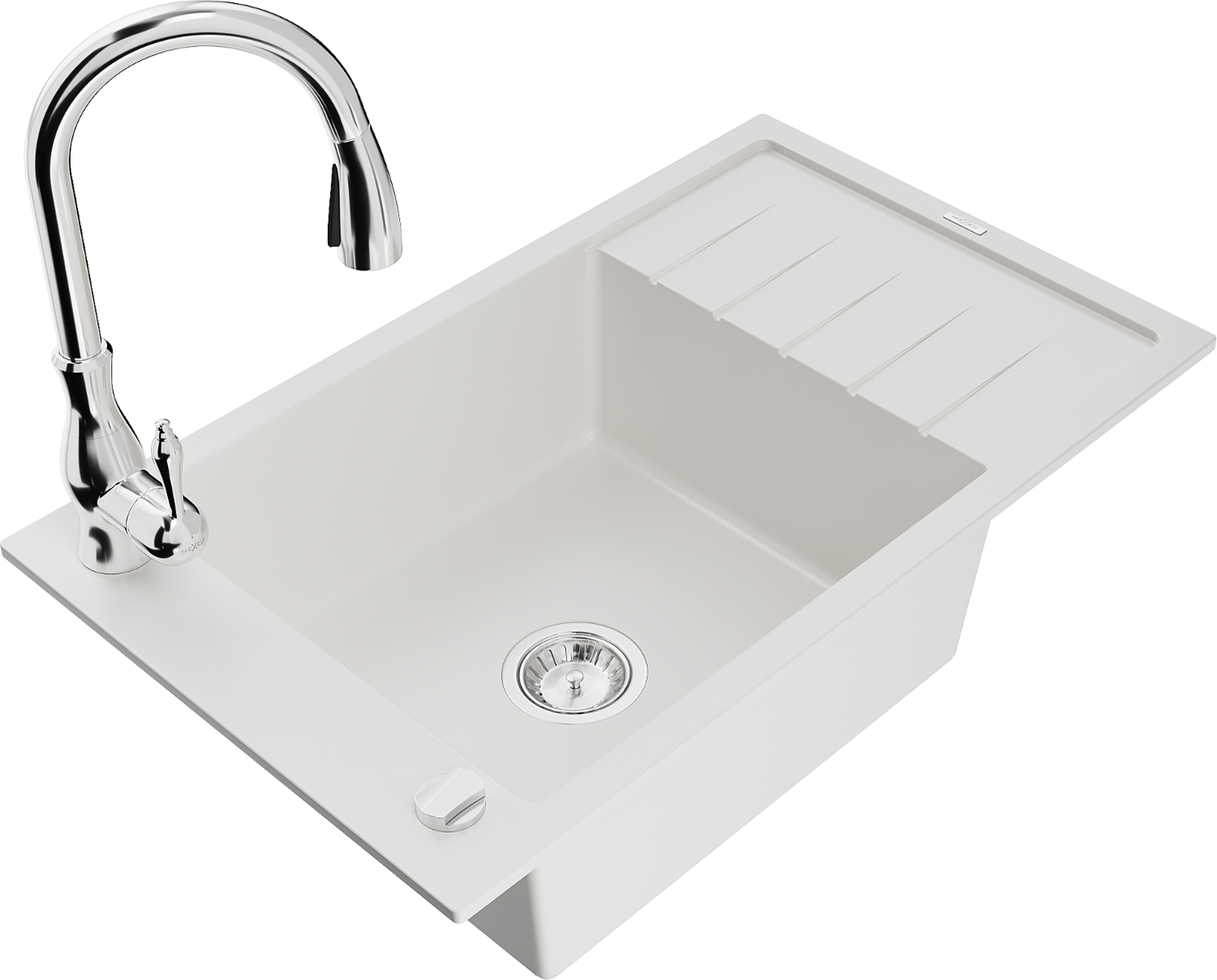 Mexen Elias гранитна мивка с 1 отделение с отцедник и кухненски смесител Savita, бял - 6511-20-672601-00