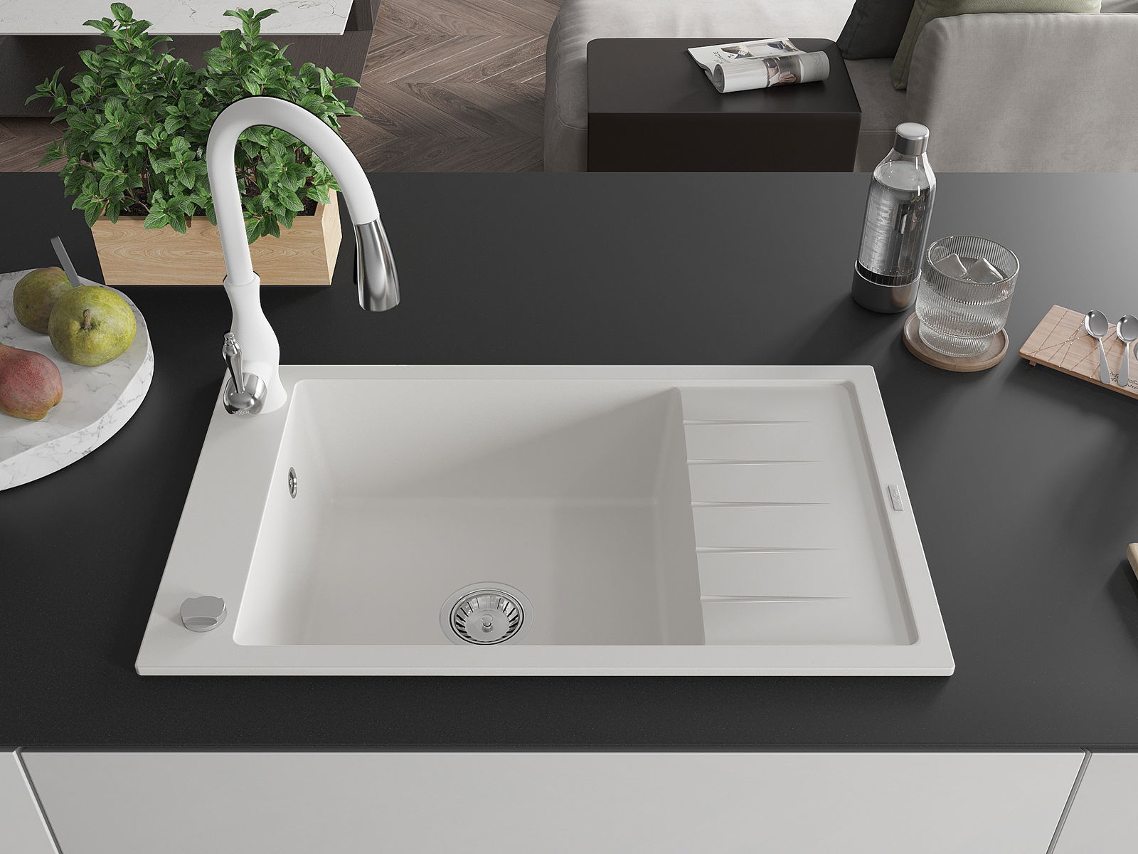 Mexen Elias гранитна мивка с едно корито с отцедник и кухненски смесител Savita, бял - 6511-20-672601-20