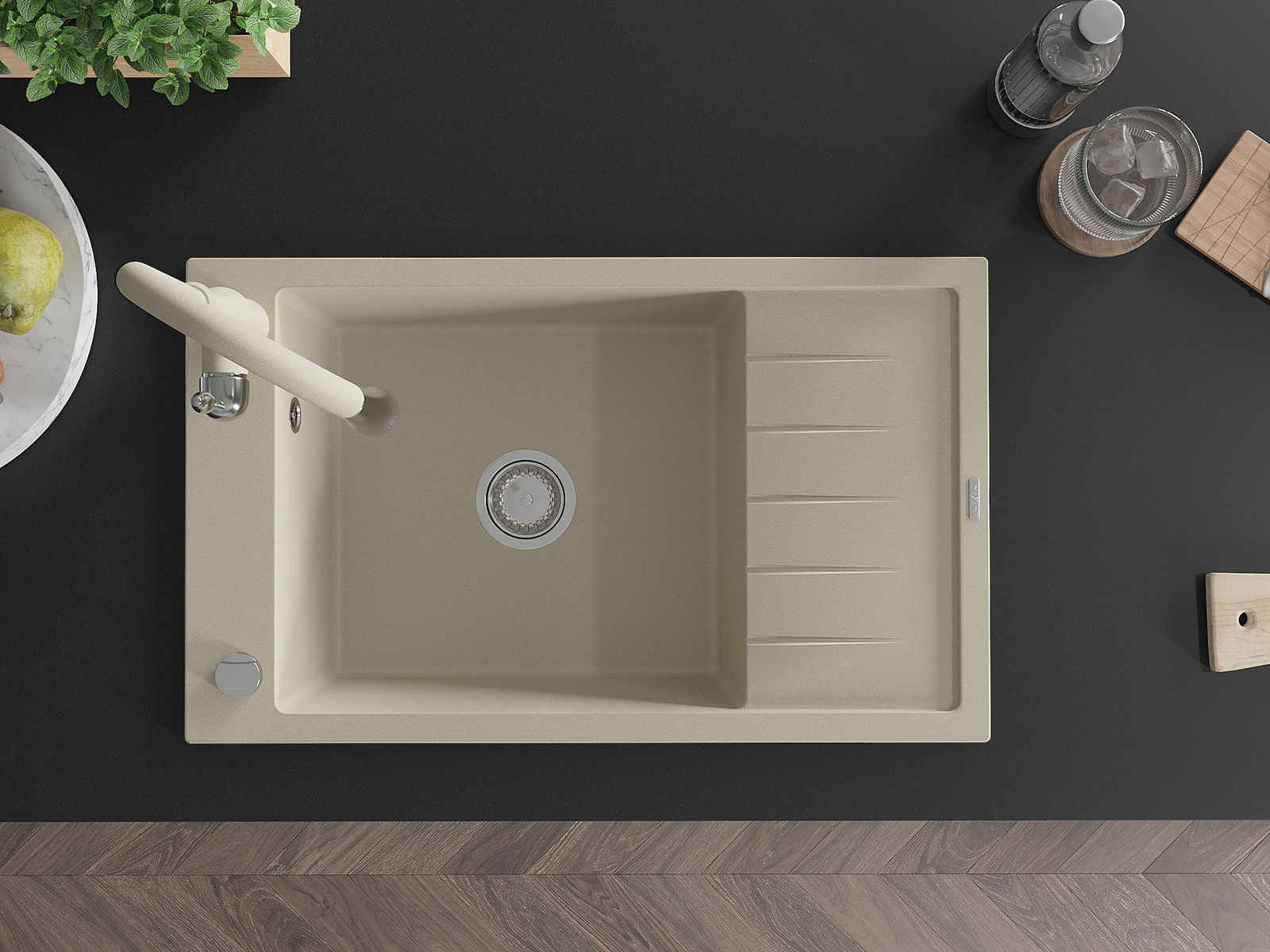 Мивката е направена от висококачествен гранит. Това е елегантно и най -вече практично допълнение към всяка кухня, независимо от нейния стил. Висококачествената и гранитна издръжливост осигуряват много години употреба.