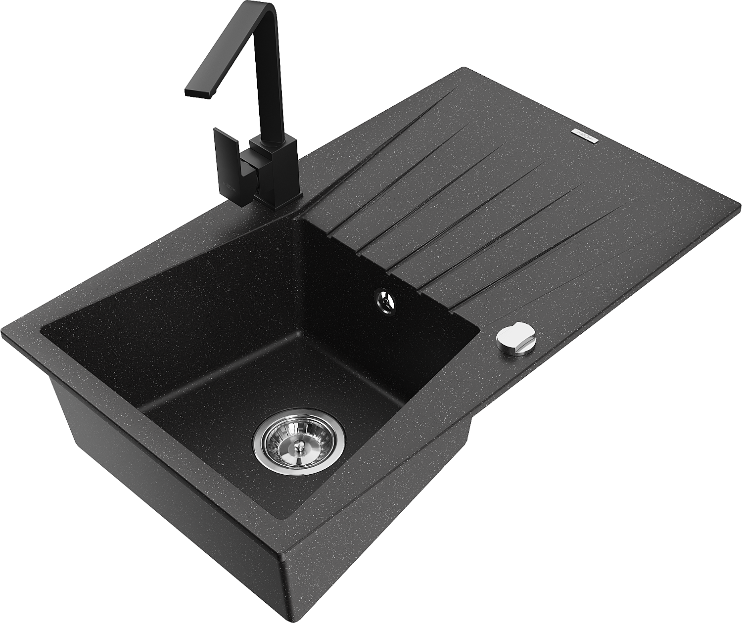 Мивка Mexen Cesar гранитна 1-камерна с отцедник и кухненски смесител Rita, черно/сребрист металик - 6514-73-670300-70