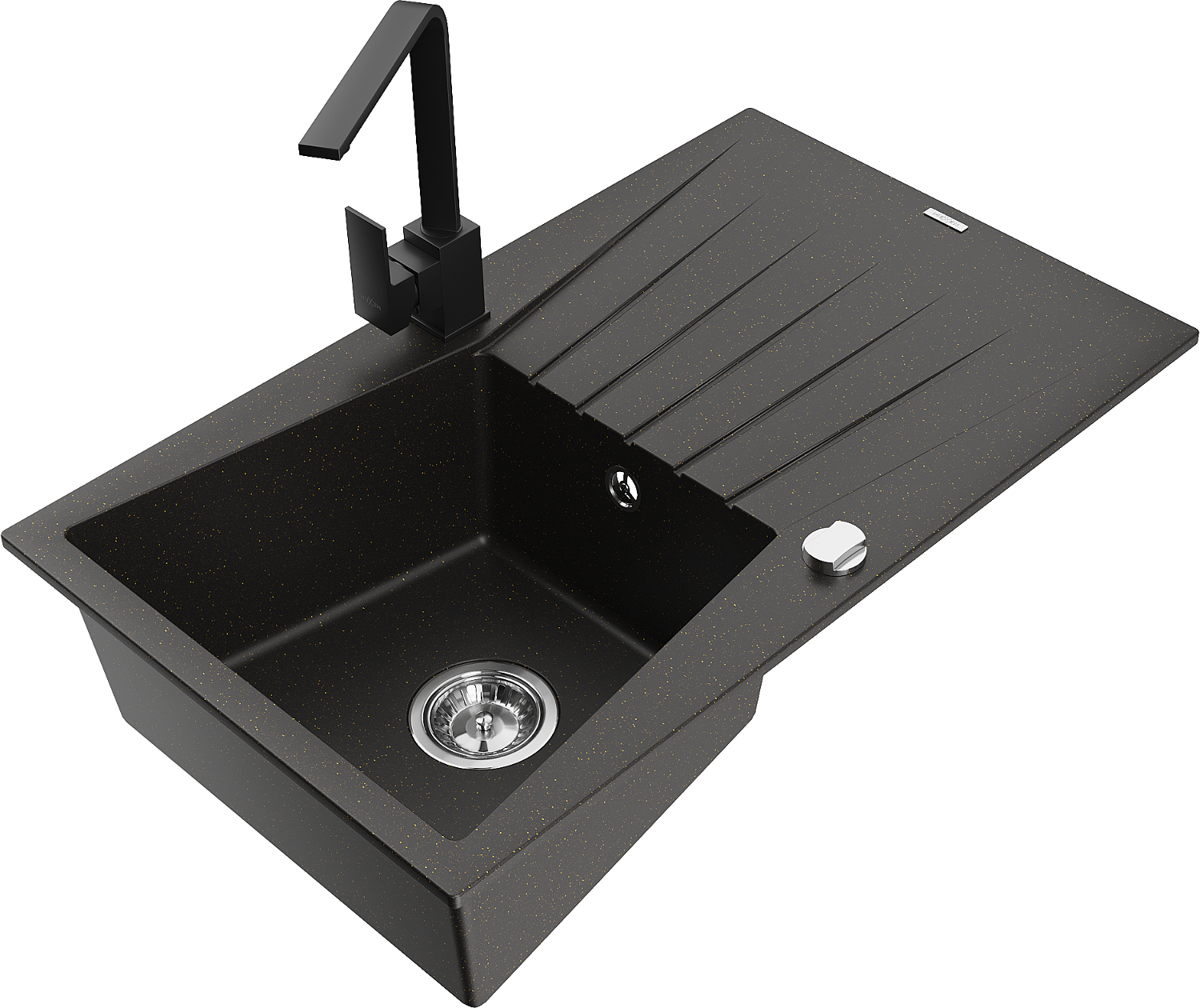 Mexen Cesar гранитна мивка с 1 отделение с отцедник и кухненски смесител Rita, черен/златен металик - 6514-75-670300-70
