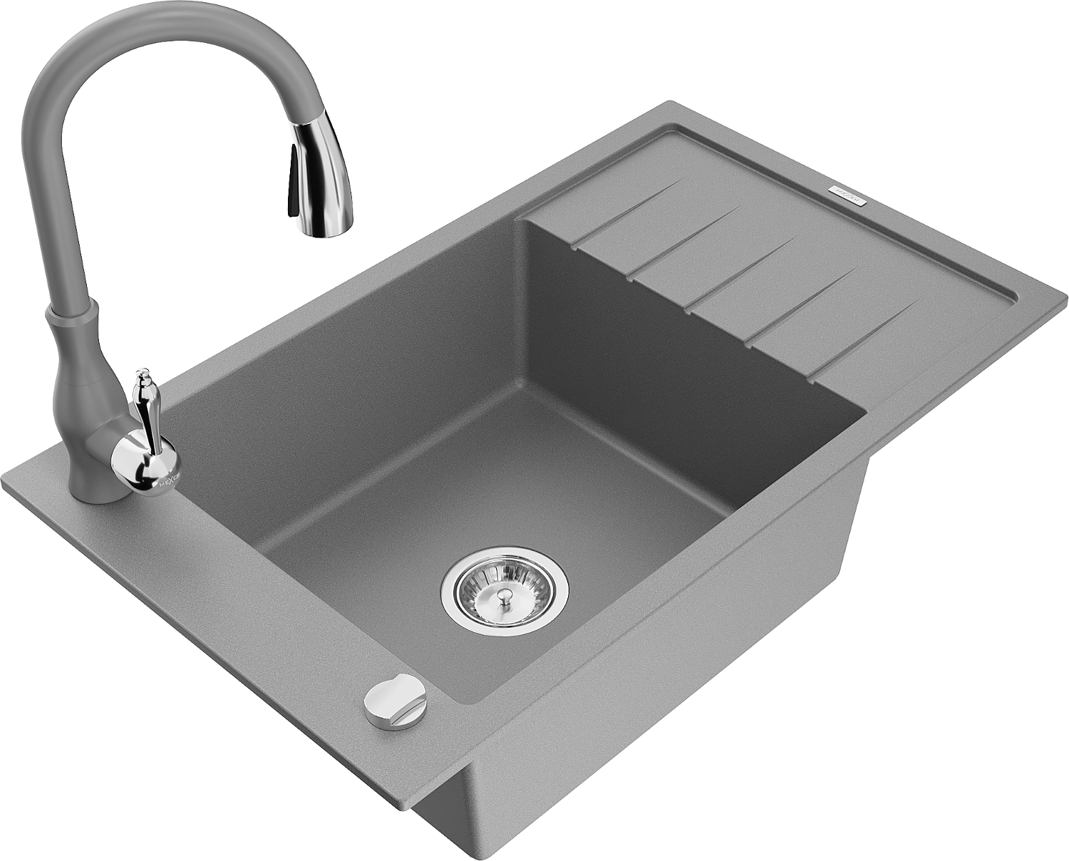 Mexen Elias гранитна кухненска мивка с 1 корито с отцедник и кухненски смесител Savita, сива - 6511-71-672601-71