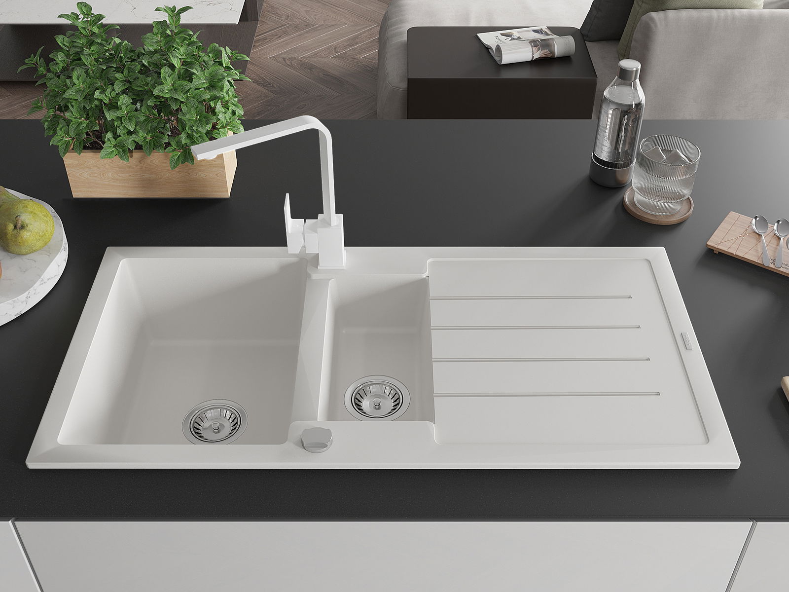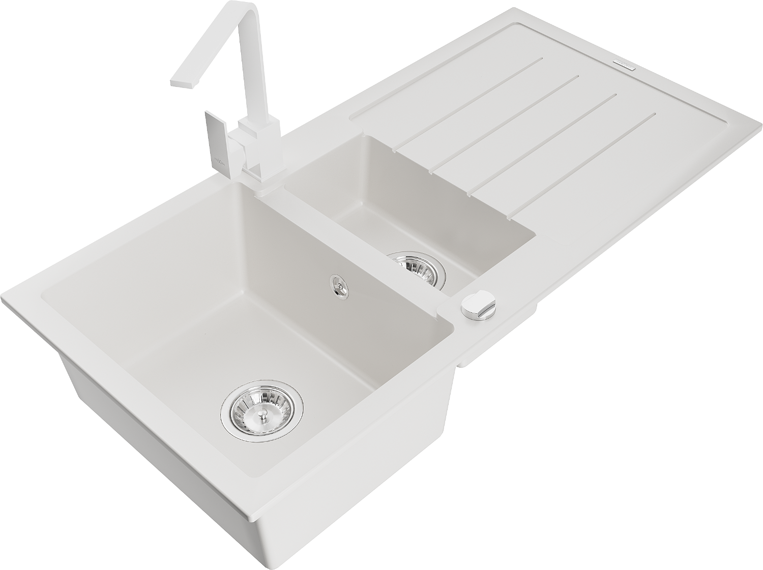 Mexen Andres гранитна мивка 1,5-коморна с отцедник и кухненски смесител Rita, бял - 6515-20-670300-20
