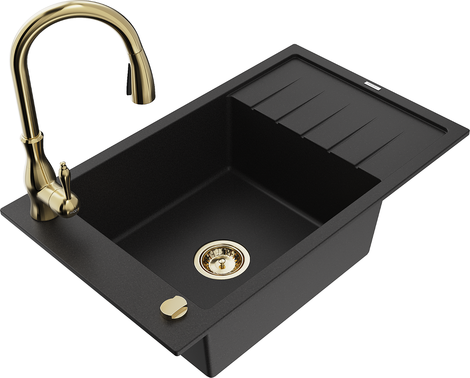 Mexen Elias гранитна кухненска мивка с 1 отделение с дренажна плоча и кухненски смесител Savita, черен - 6511-77-672601-50