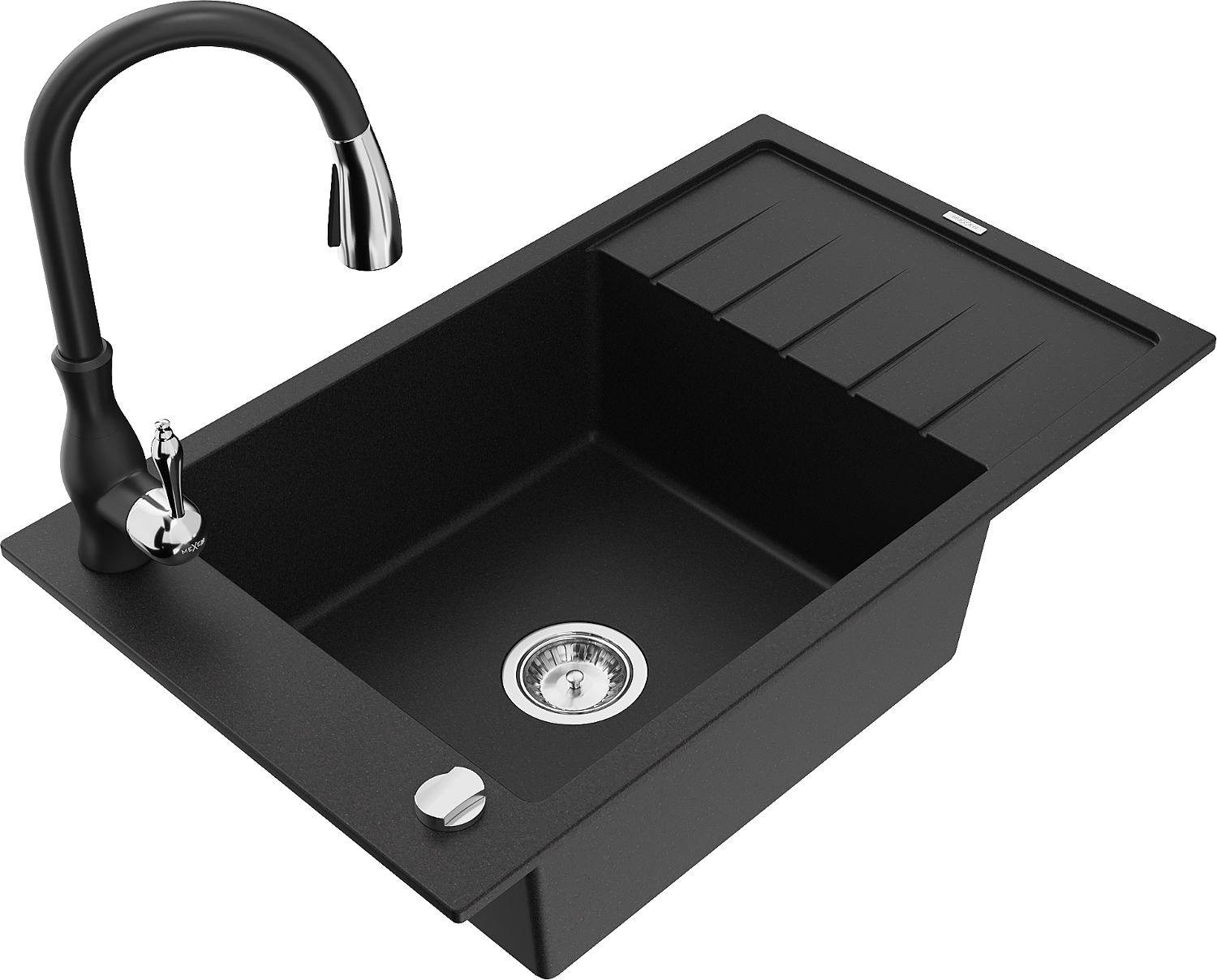 Мивка от гранит Mexen Elias с 1 отделение с функция за отцеждане и кухненски смесител Savita, черен - 6511-77-672601-70