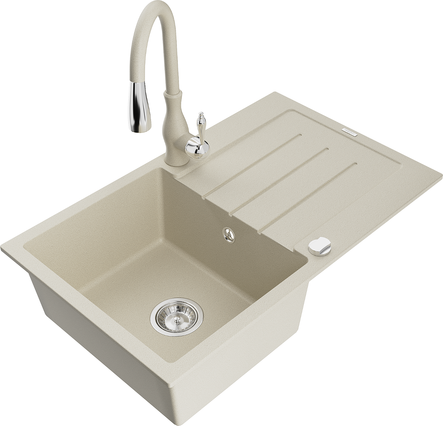 Mexen Bruno гранитна мивка с 1 отделение със сушилник и кухненски смесител Savita, бежова - 6513-69-672601-69