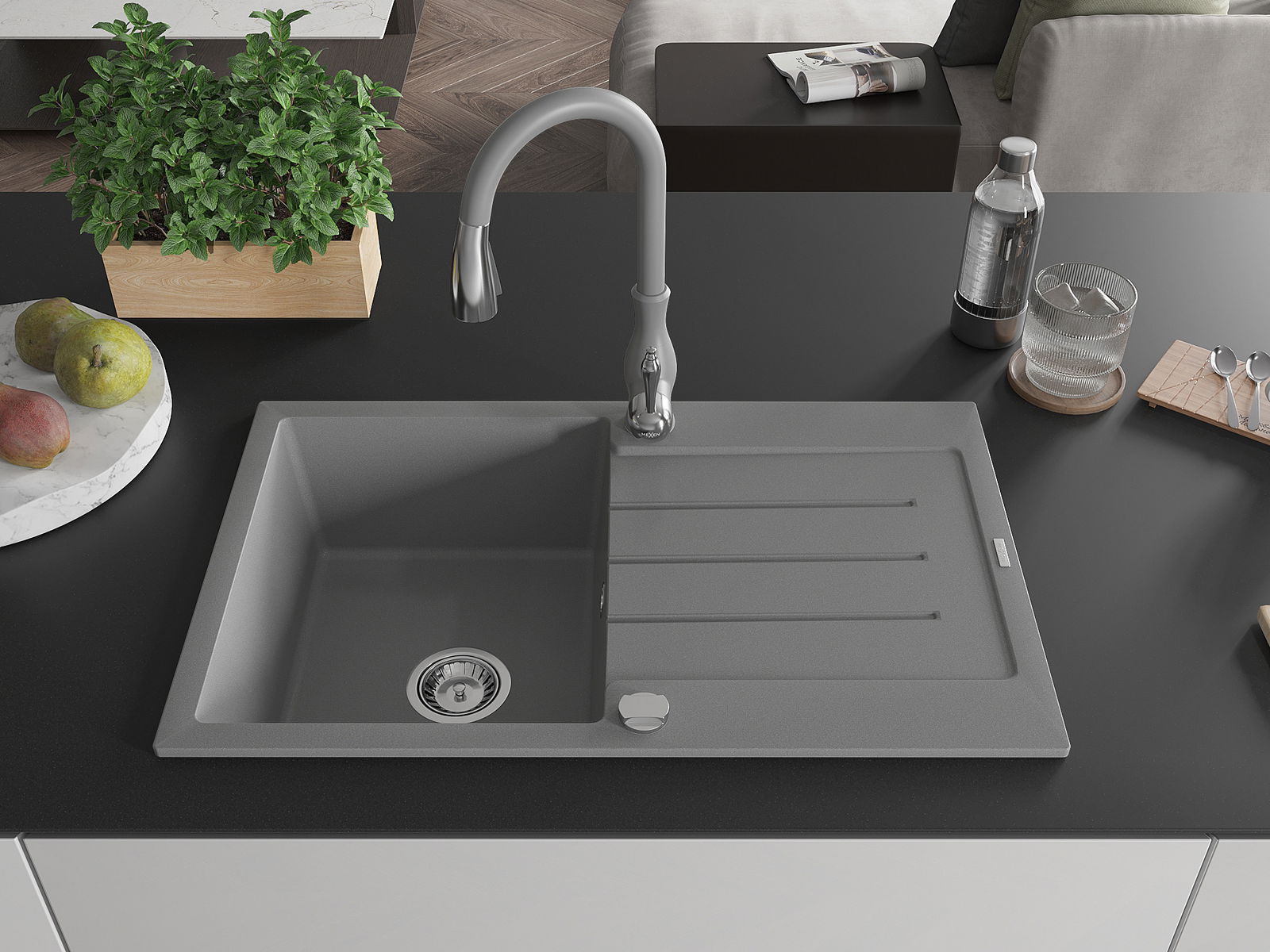 Мивката е направена от висококачествен гранит. Това е елегантно и най -вече практично допълнение към всяка кухня, независимо от нейния стил. Висококачествената и гранитна издръжливост осигуряват много години употреба.