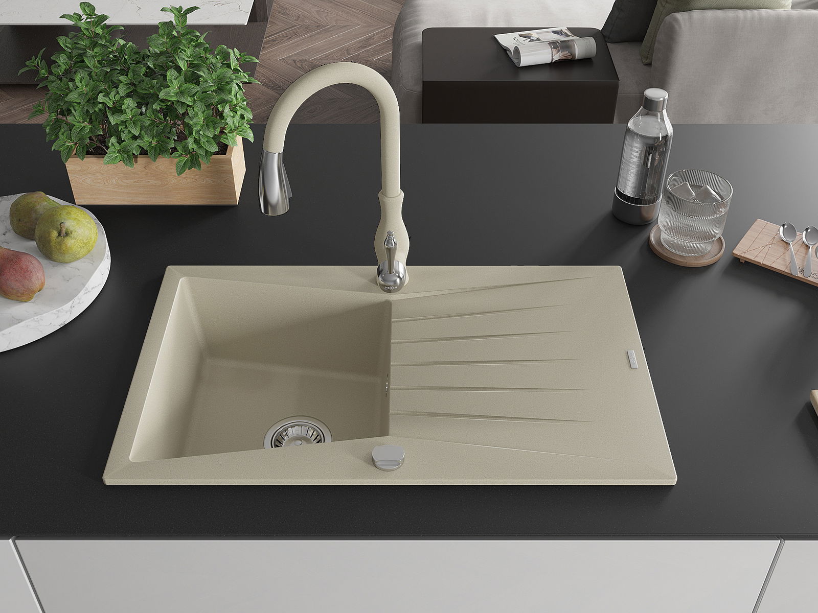 Мивката е направена от висококачествен гранит. Това е елегантно и най -вече практично допълнение към всяка кухня, независимо от нейния стил. Висококачествената и гранитна издръжливост осигуряват много години употреба.
