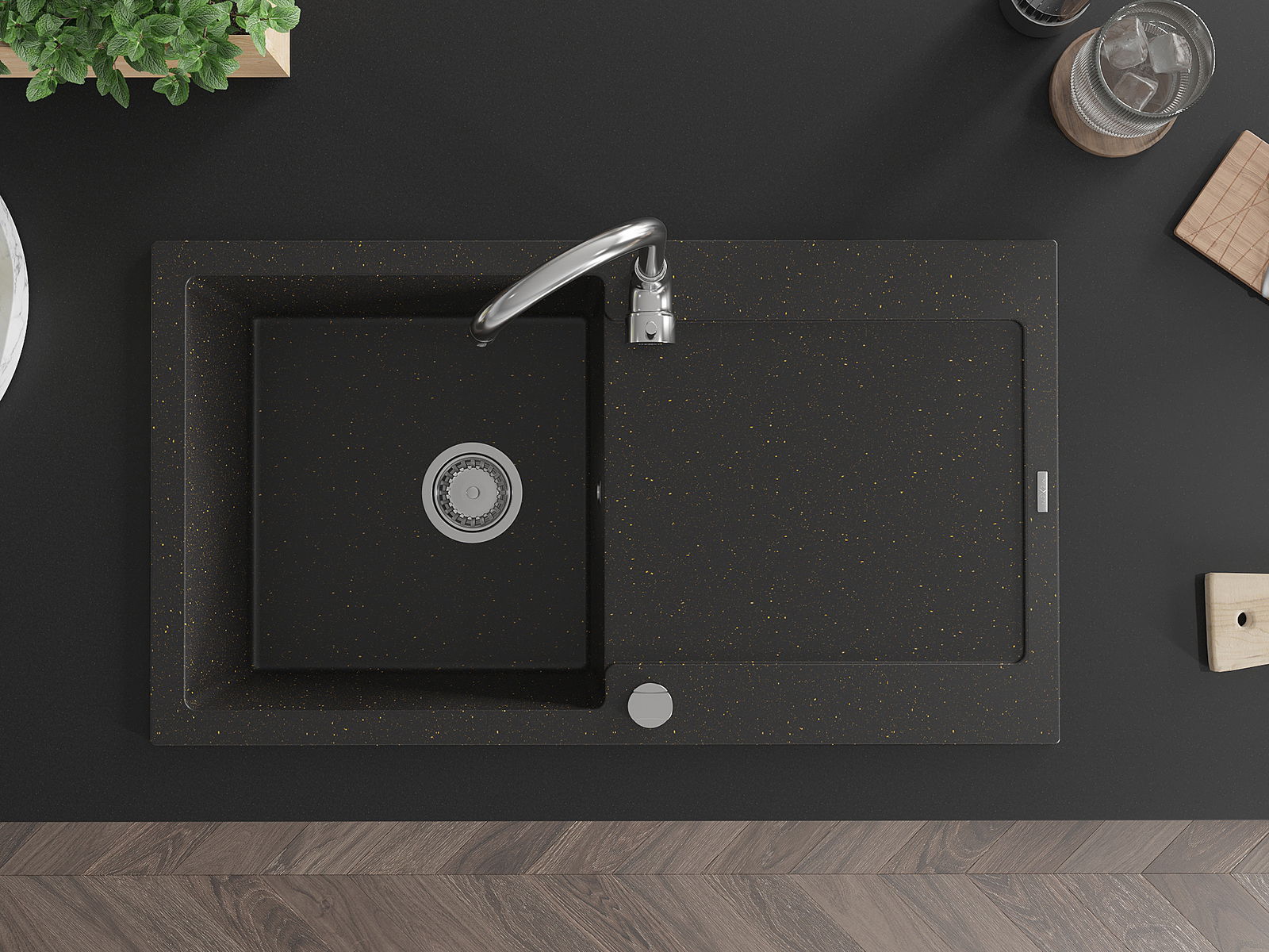 Mexen Leo гранитна мивка с 1 отделение с отцедник и кухненски смесител Telma, черен/златен металик - 6501-75-670200-00