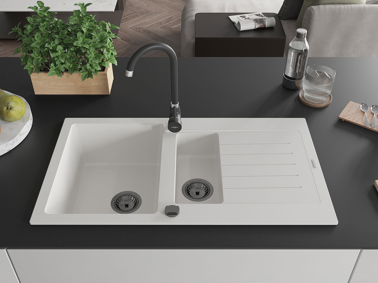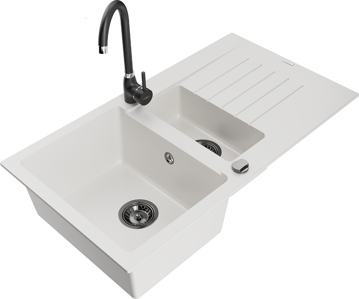 Mexen Matias гранитна кухненска мивка 1,5-коморова с плот и кухненски смесител Telma, бял - 6502-20-670200-70