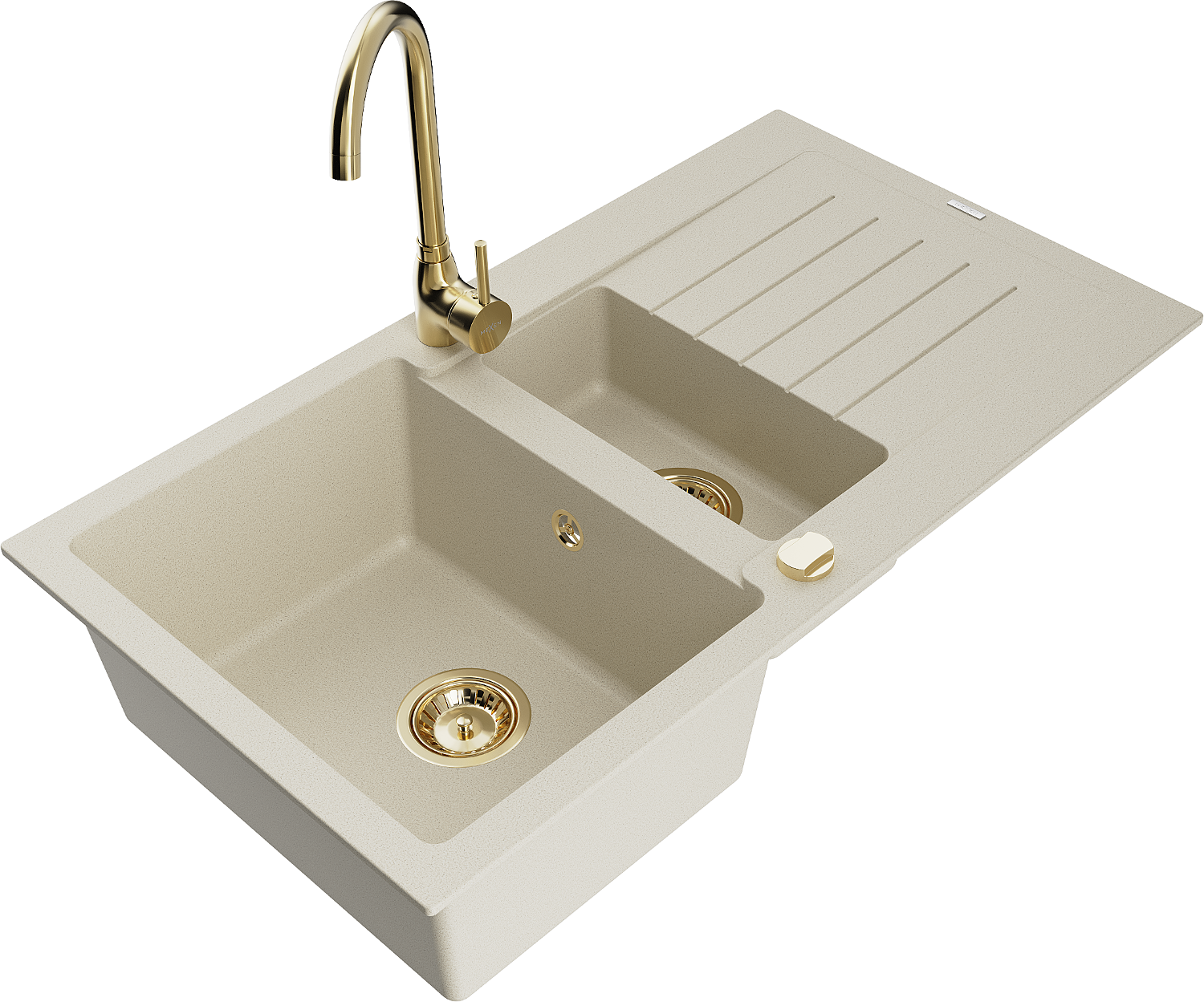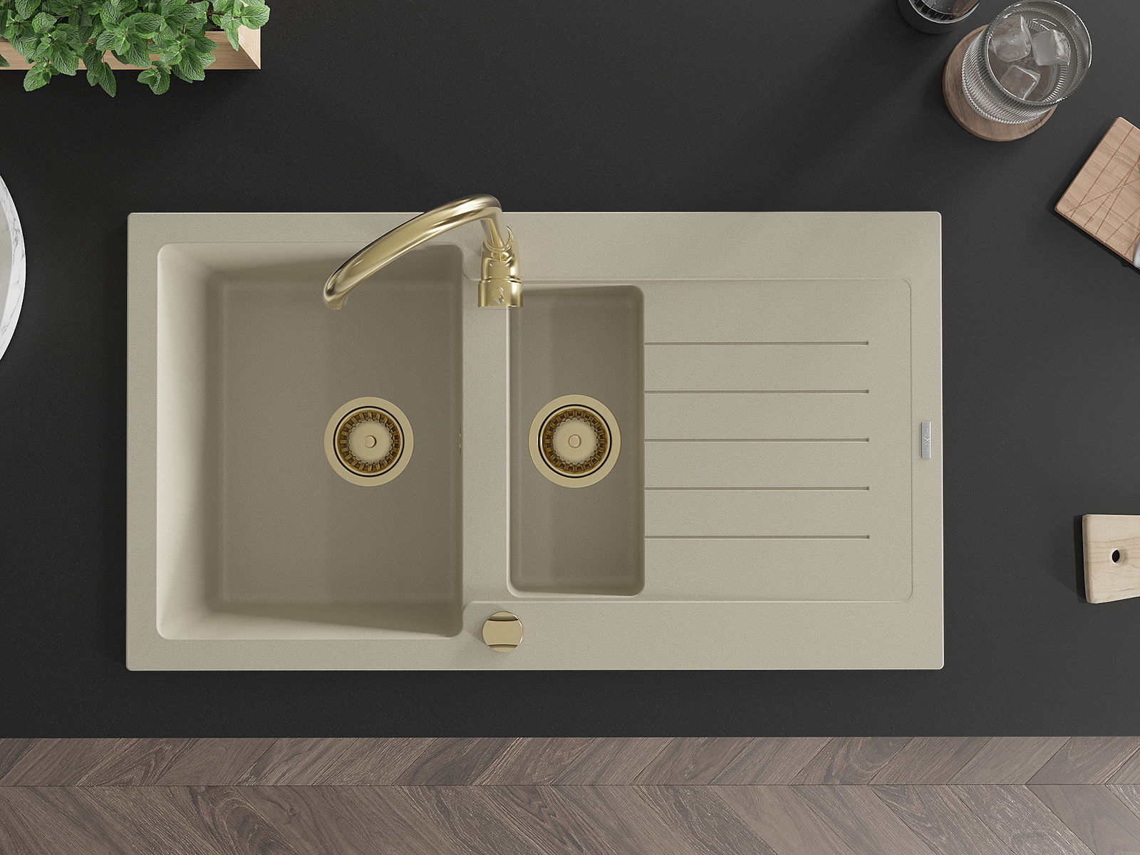 Mexen Matias гранитна мивка 1,5-камерна с отцедник и кухненски смесител Telma, бежов - 6502-69-670200-50
