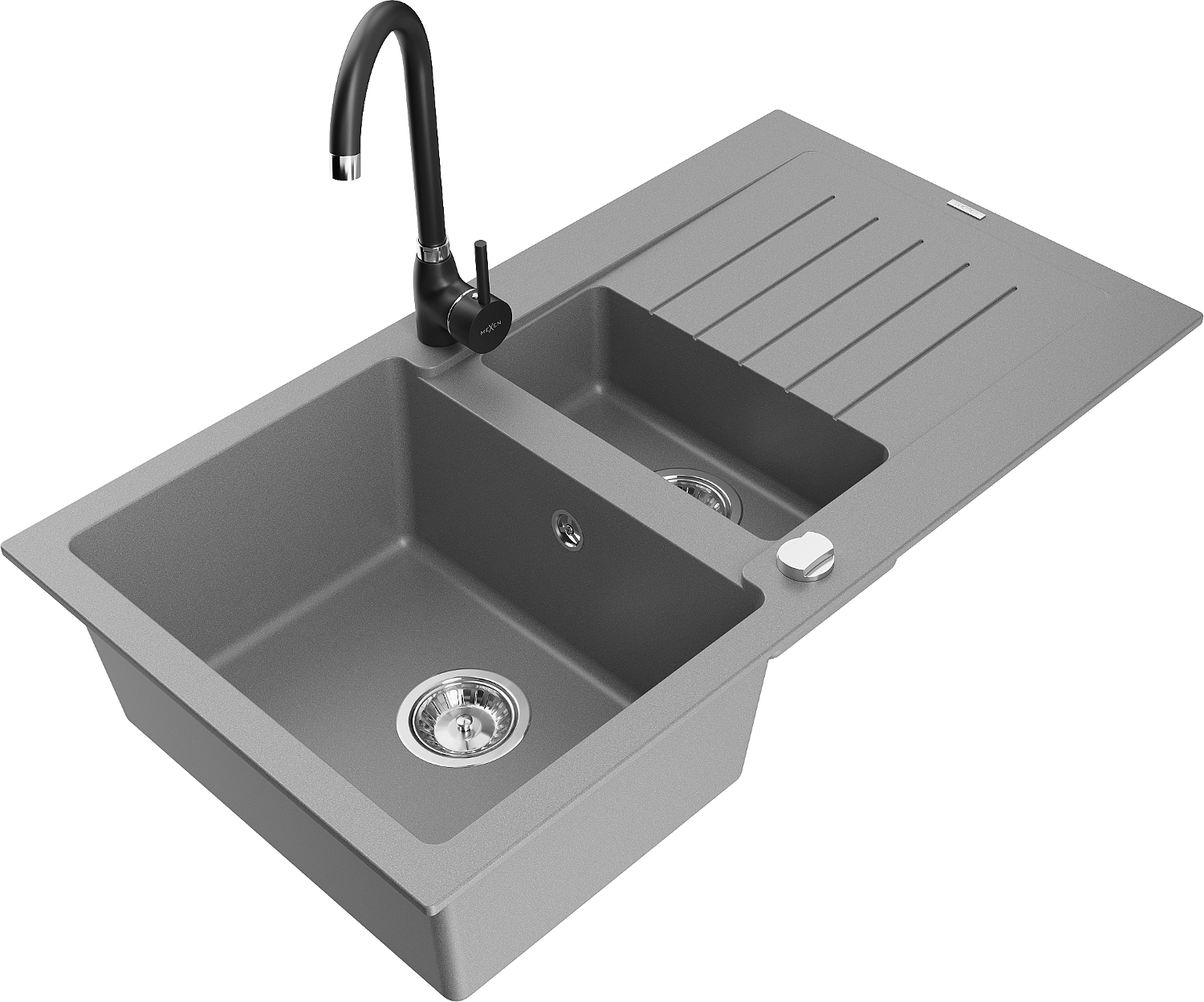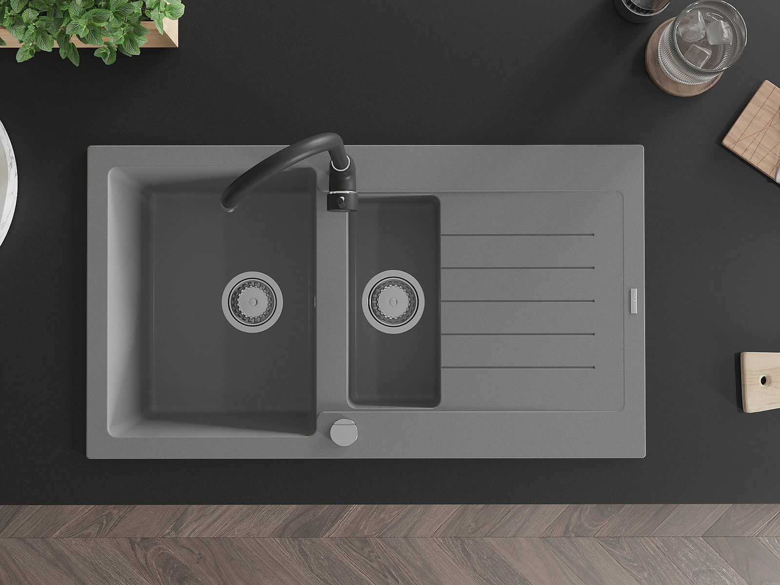 Mexen Matias гранитна мивка 1,5-коморна с оцеждател и кухненски смесител Telma, сива - 6502-71-670200-70