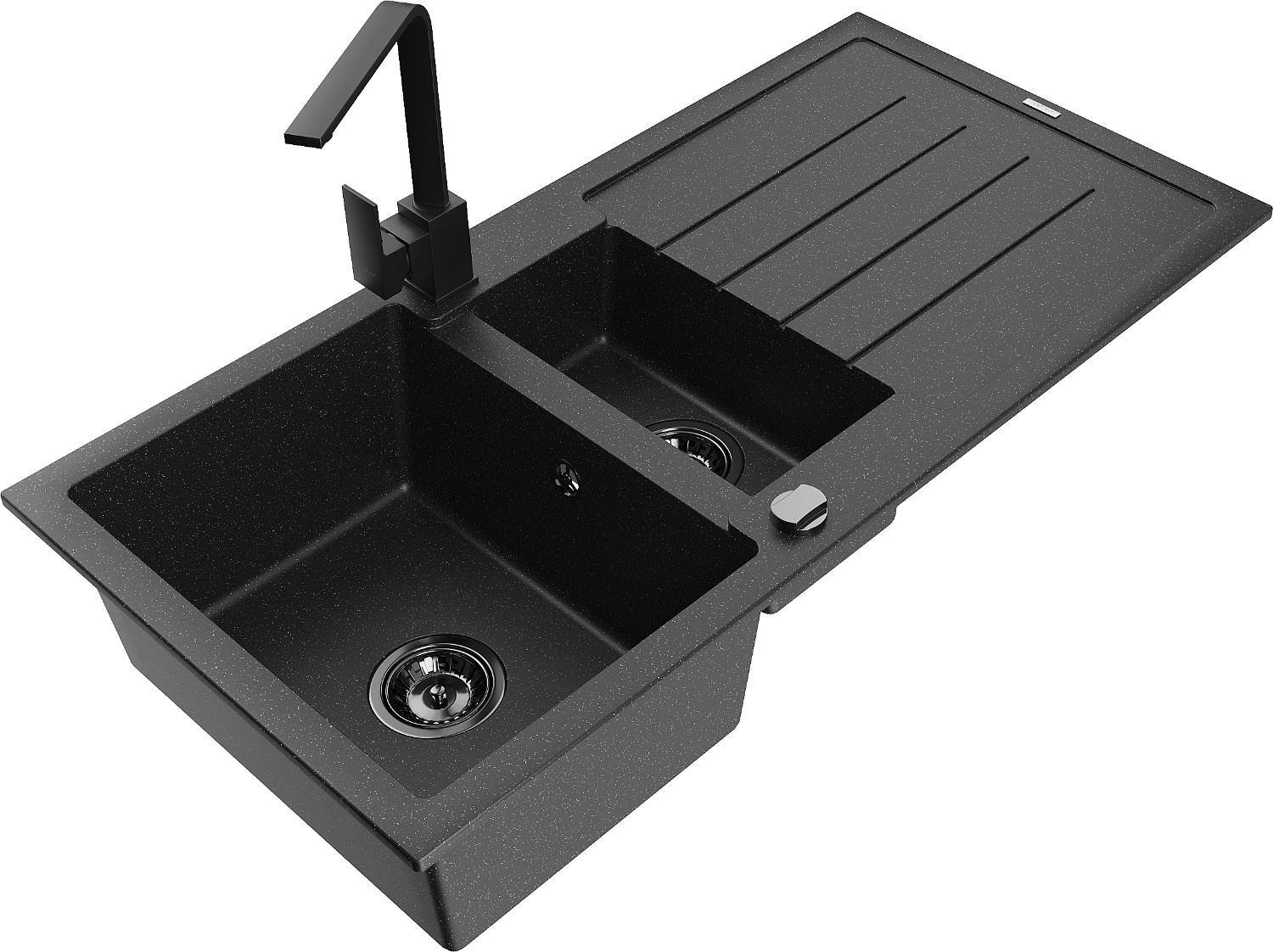 Mexen Andres гранитна мивка 1,5-камерна с отцедник и кухненски смесител Rita, черно/сребърно - 6515-73-670300-70-B