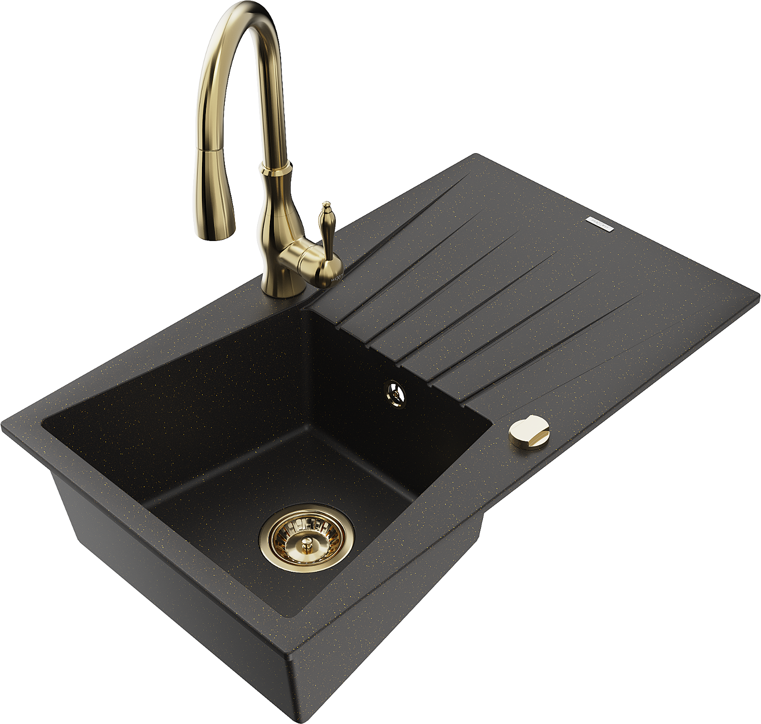 Mexen Cesar гранитна мивка с 1 камера и отцедник и кухненски смесител Savita, черен/златист металик - 6514-75-672601-50