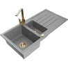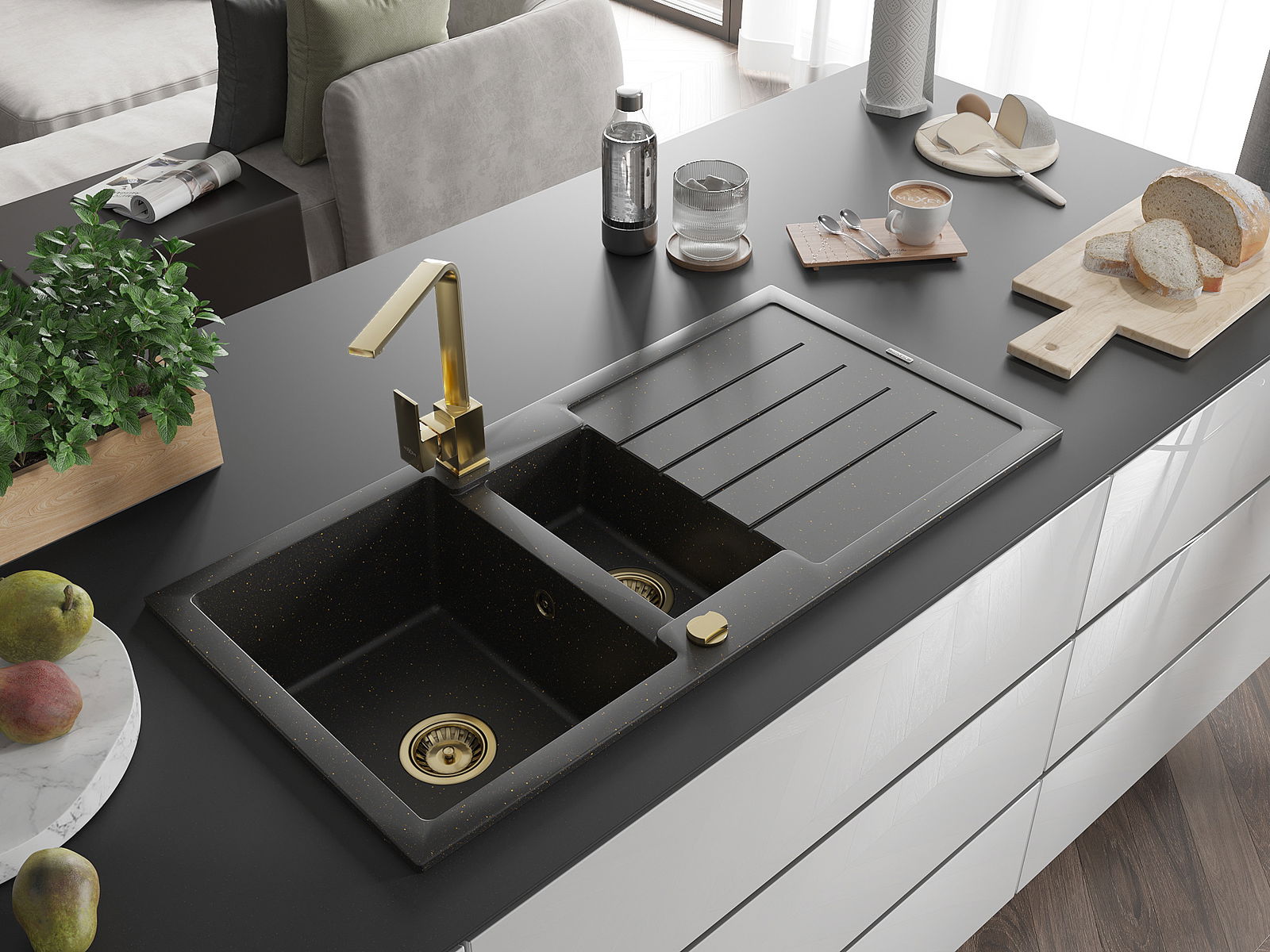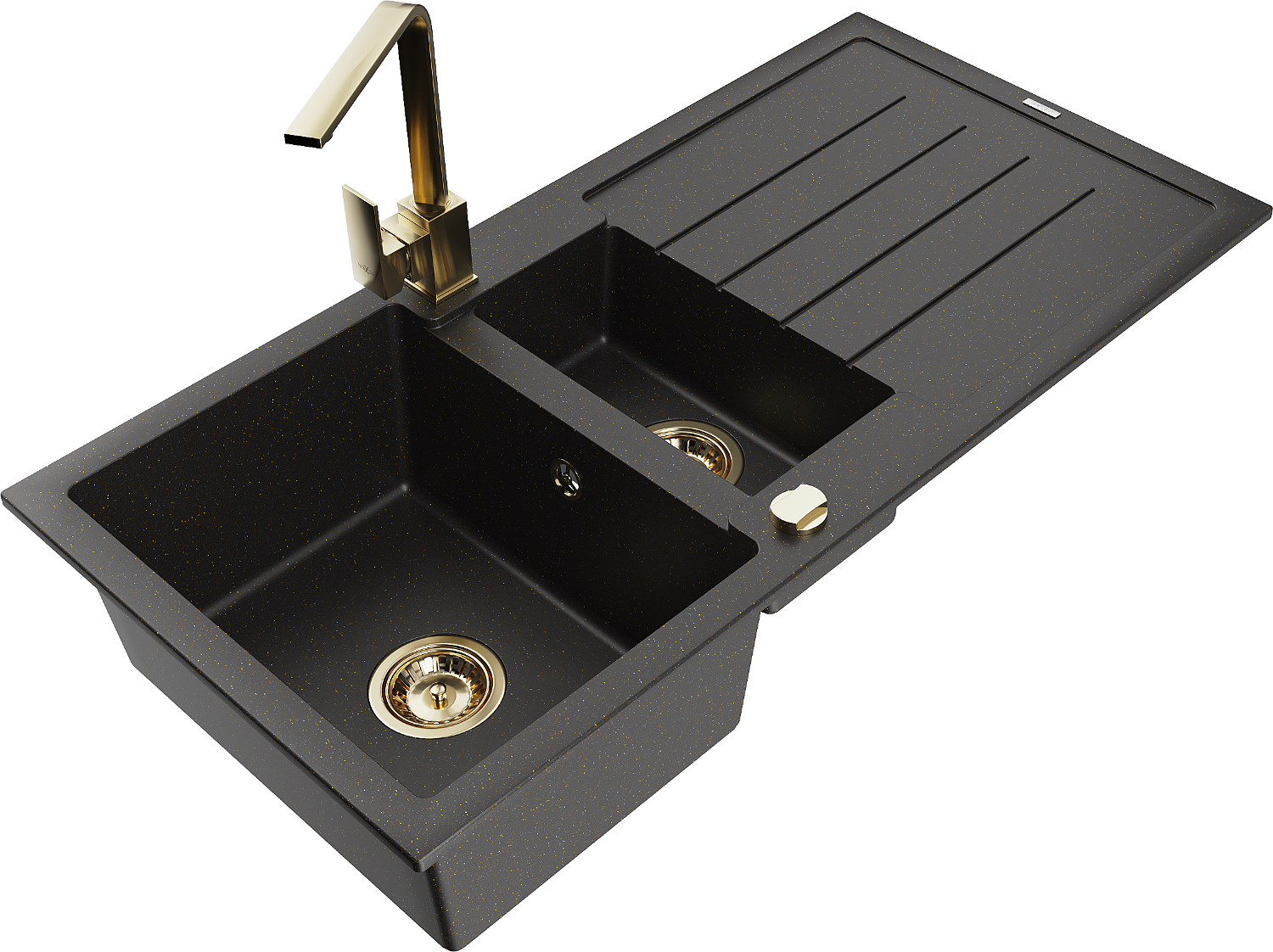 Мивка от гранит Mexen Andres с 1,5 камери с отцедник и кухненски смесител Rita, черен/златен металик - 6515-75-670300-50