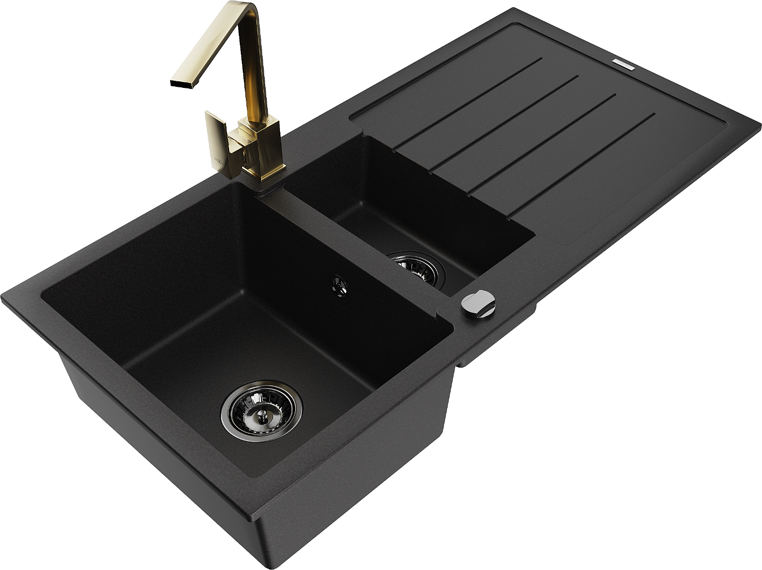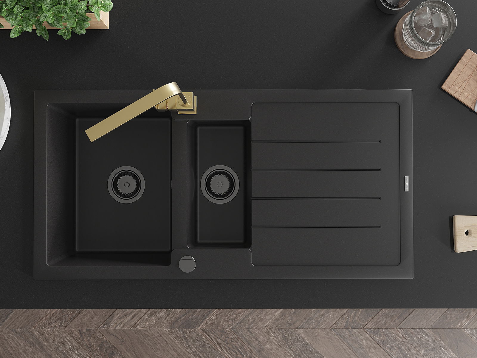 Mexen Andres гранитна мивка с 1,5 камери и отцедник и кухненски смесител Rita, черен/златен металик- 6515-75-670300-50-B