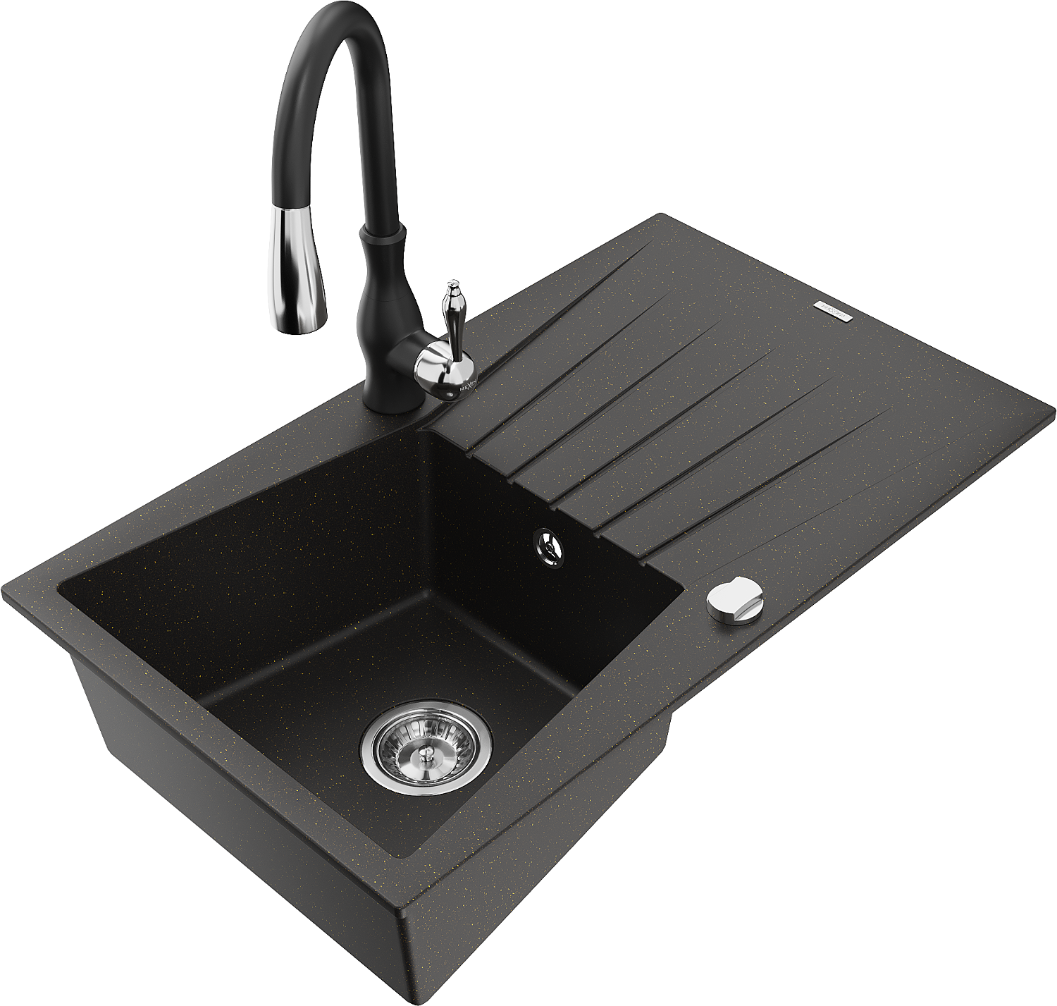 Mexen Cesar гранитна кухненска мивка с 1 отделение и отцедник и кухненски смесител Savita, черен/златист металик - 6514-75-6726?