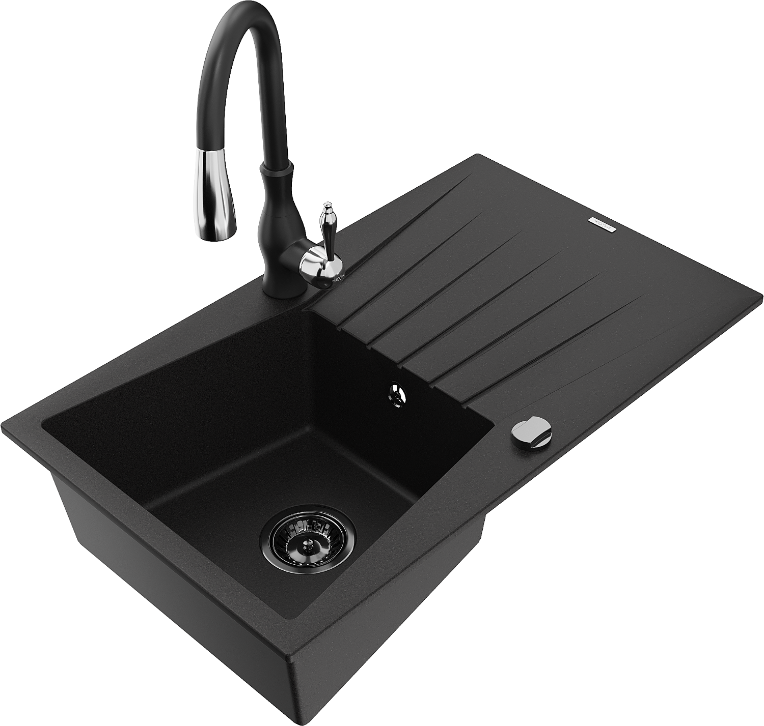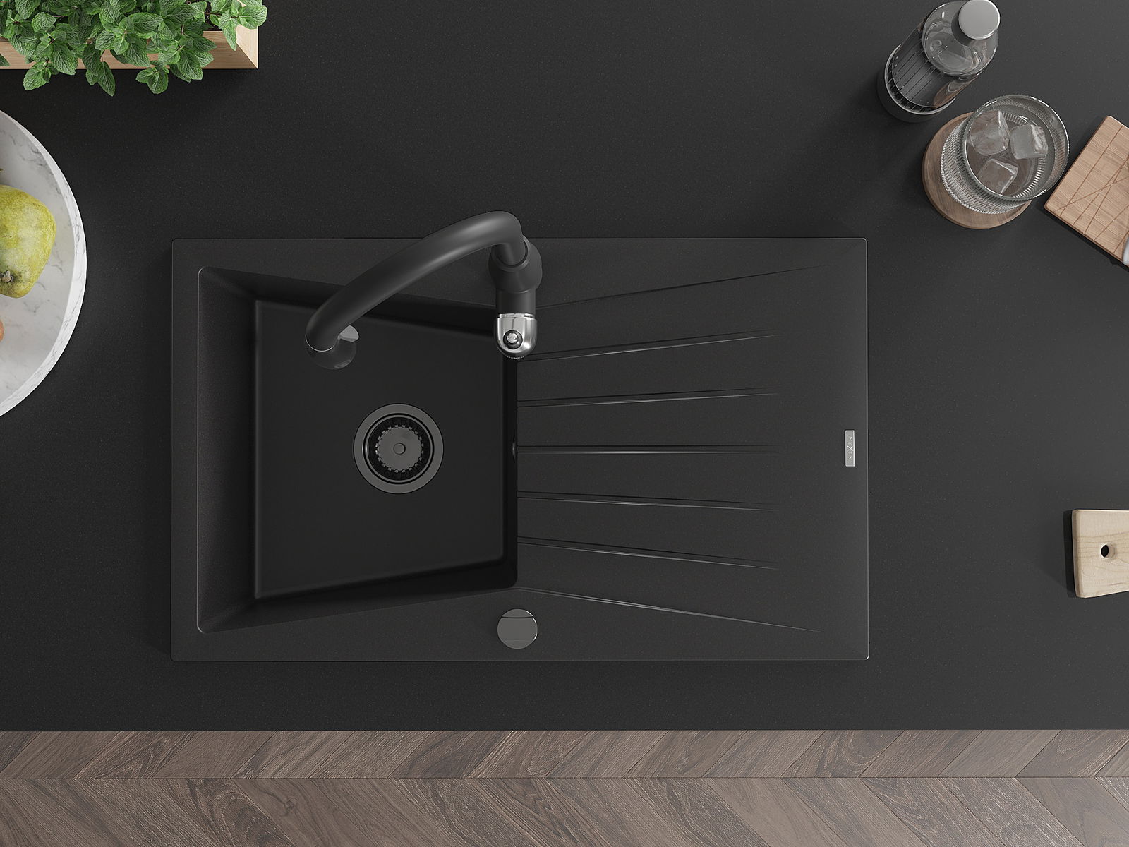 Mexen Cesar гранитна кухненска мивка с 1 корито с отцедник и смесител Savita, черен - 6514-77-672601-70-B