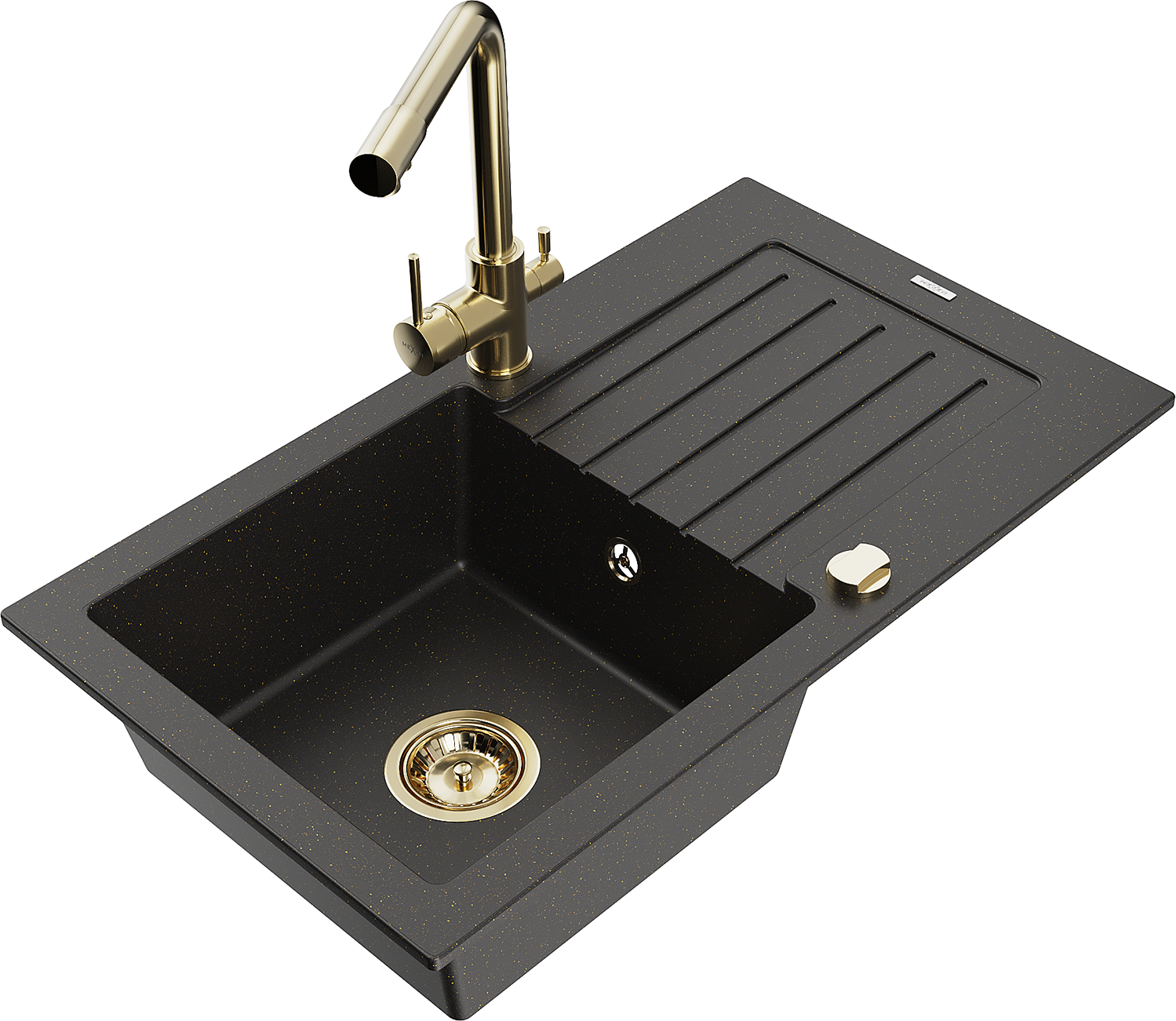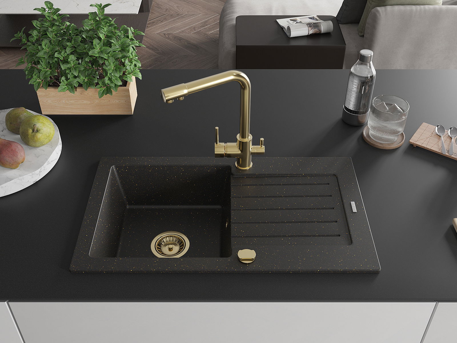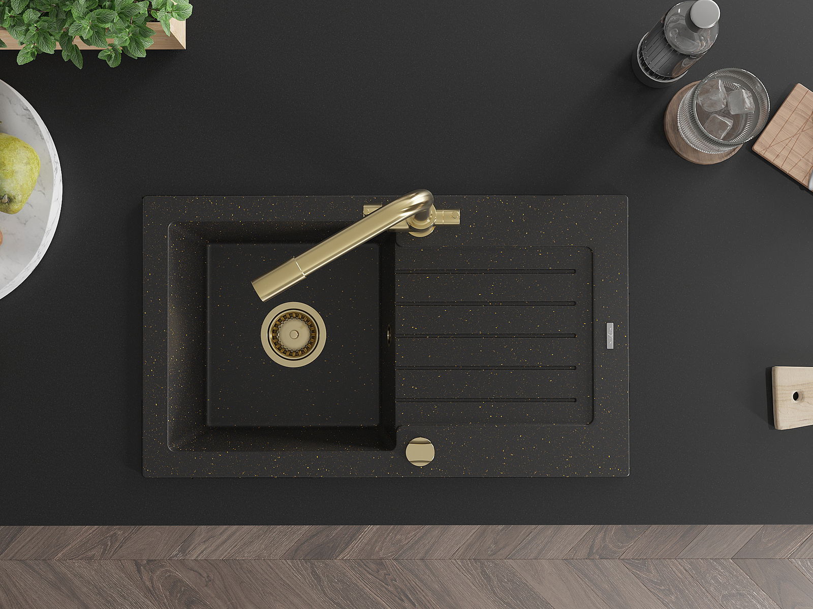 Mexen Pablo гранитна мивка с 1 камера със сушилник и кухненски смесител Duero, черно/златен металик - 6510-75-671600-50