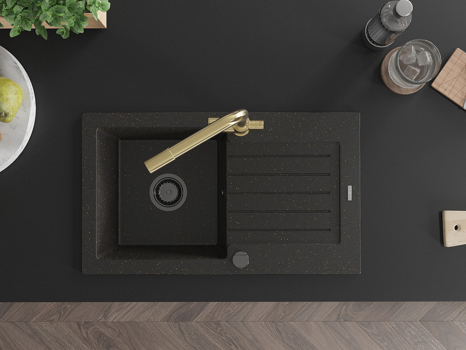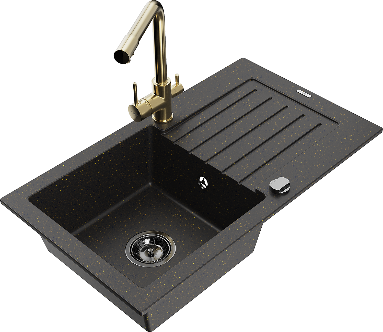 Mexen Pablo мивка гранитна 1-камерна с отцедник и кухненски смесител Duero, черен/златист металик - 6510-75-671600-50-B