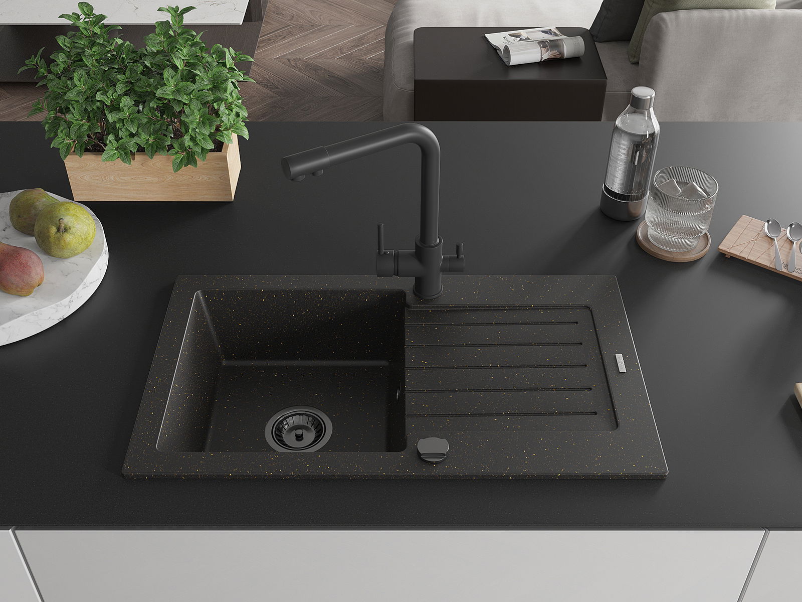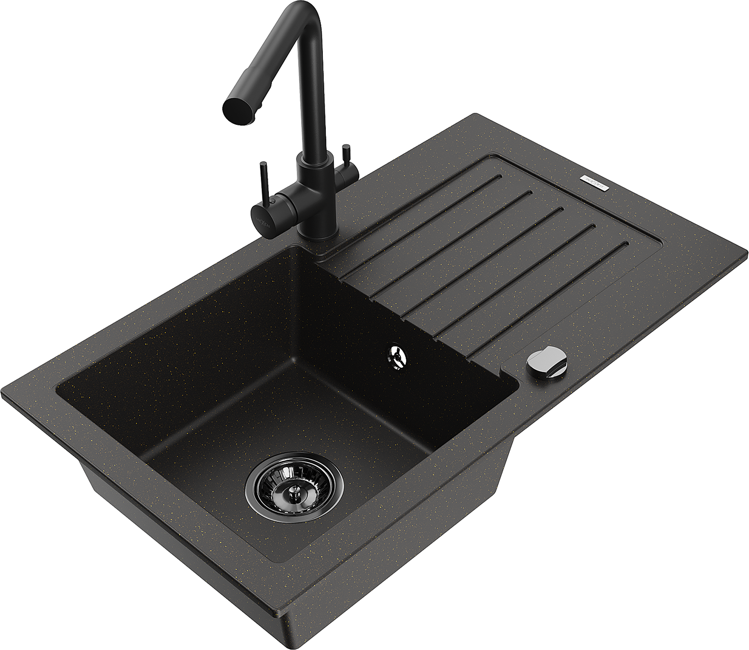 Mexen Pablo гранитна мивка с 1 камера, отцедник и кухненски смесител Duero, черно/златен металик - 6510-75-671600-70-B
