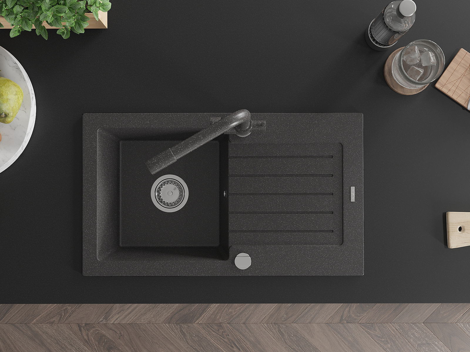 Mexen Pablo гранитна мивка с 1 камера и отцедник с кухненски смесител Duero, черен на пръски - 6510-76-671600-76