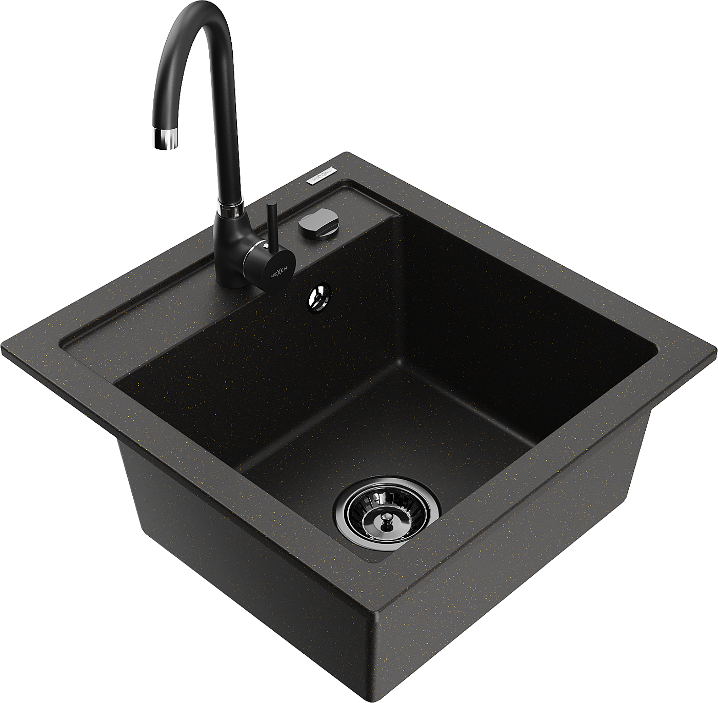 Гранитна кухненска мивка с един басейн Mexen Vito с кухненски смесител Telma, черен/златен металик - 6503-75-670200-70-B