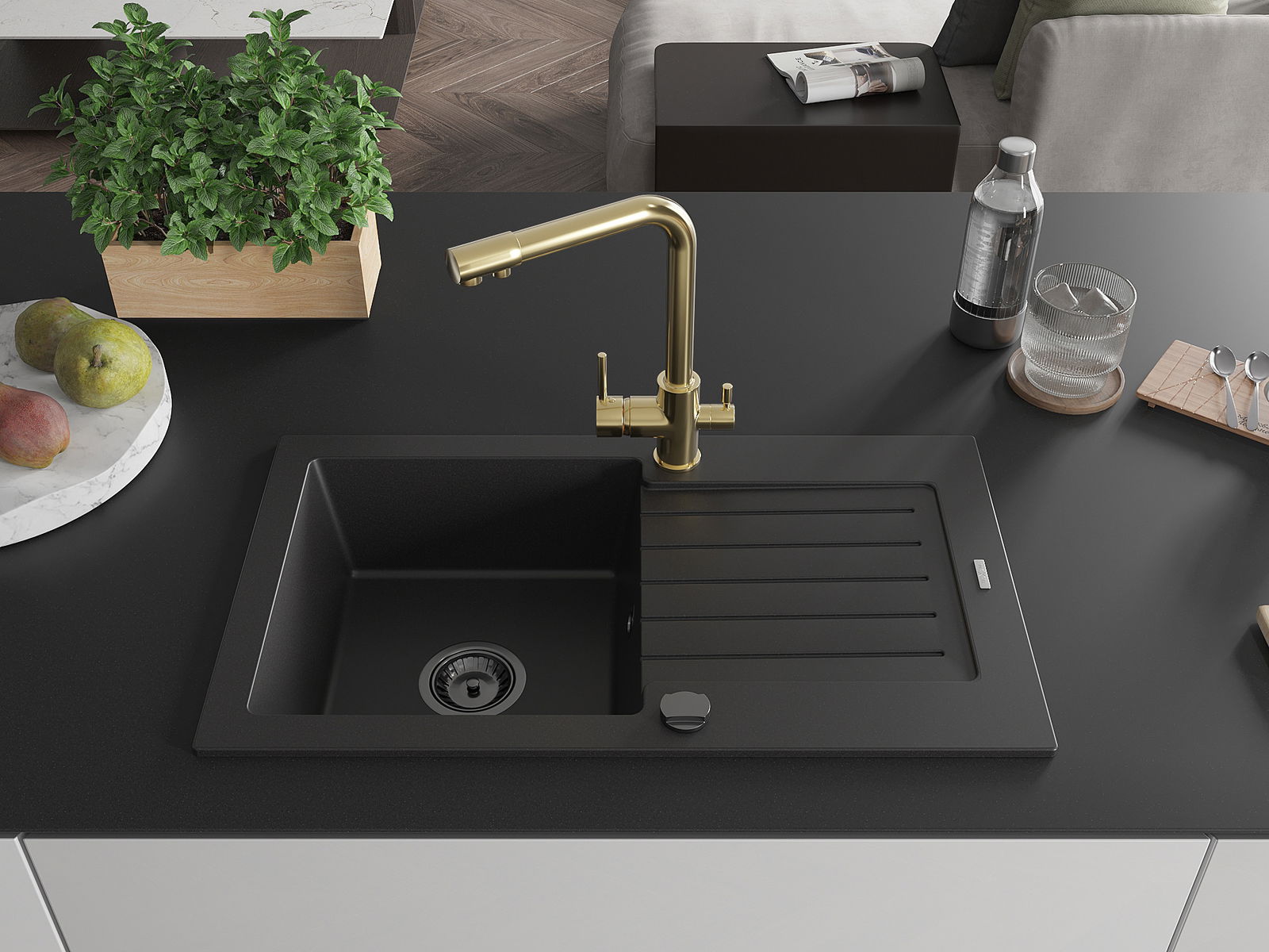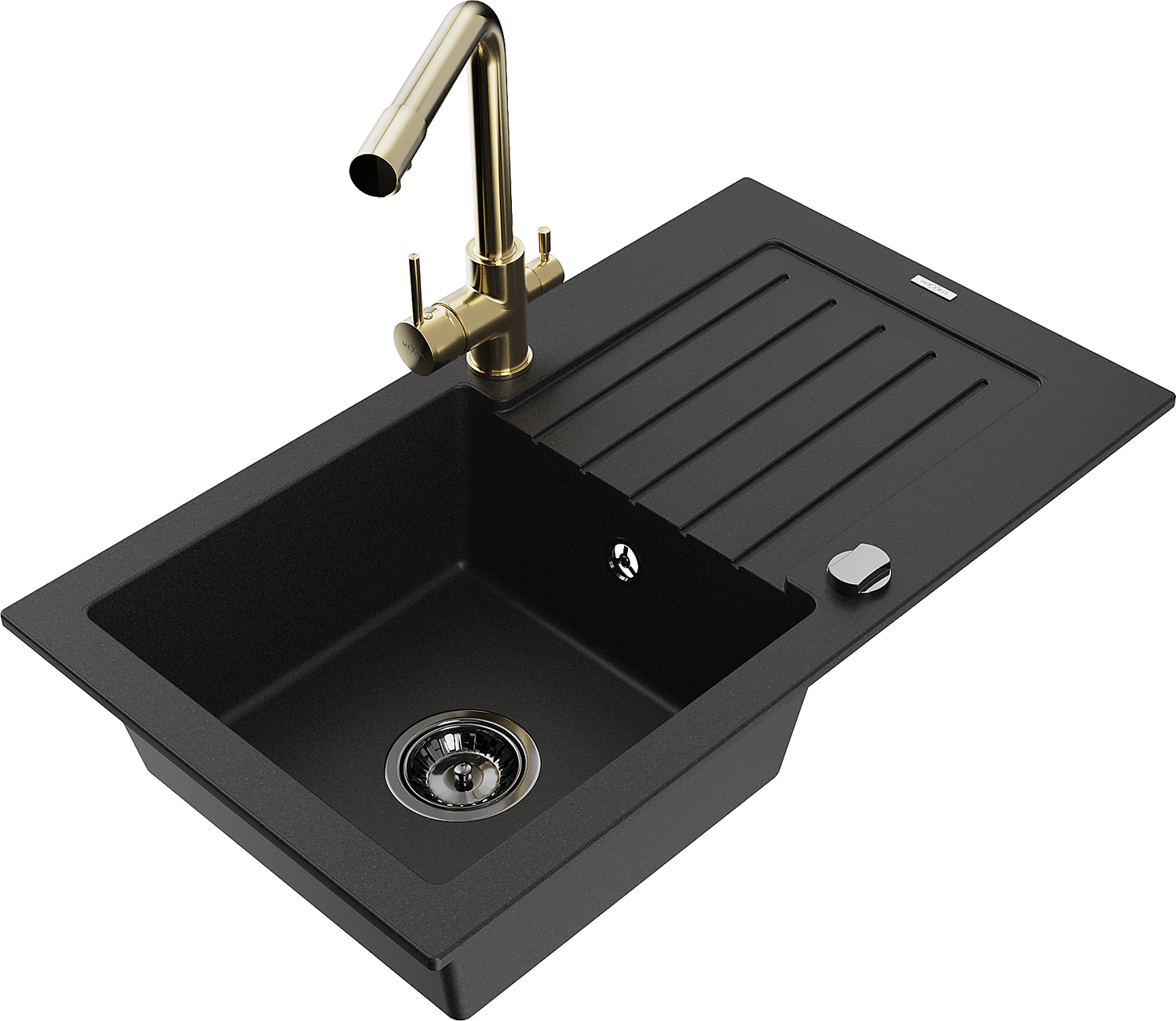 Mexen Pablo гранитна мивка с една камера с отцедник и кухненски смесител Duero, черен - 6510-77-671600-50-B