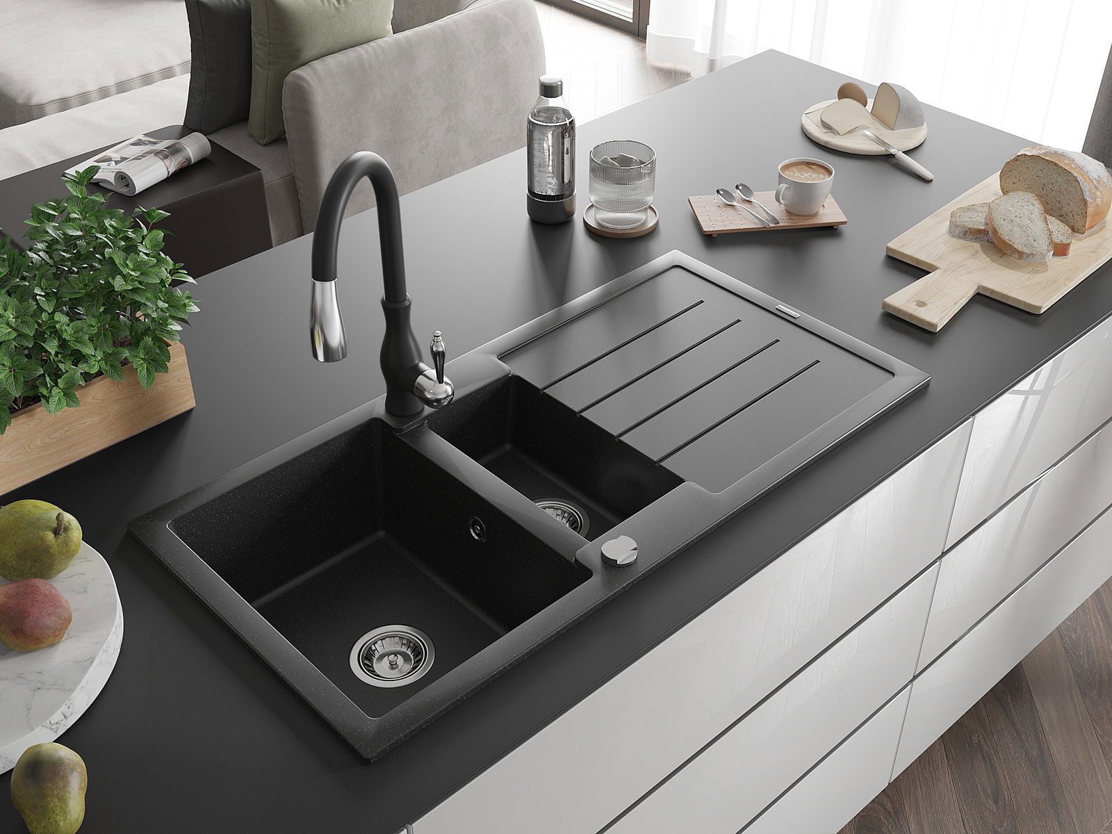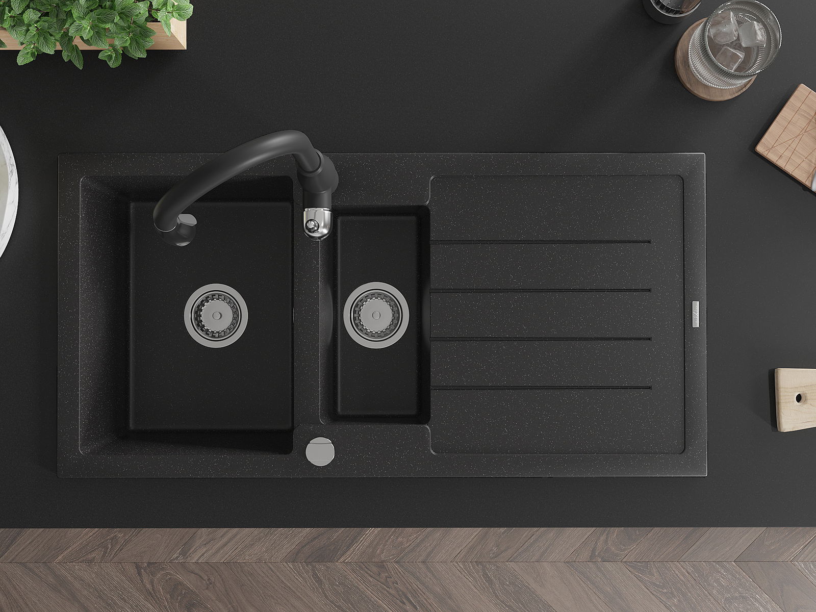 Мивката е направена от висококачествен гранит. Това е елегантно и най -вече практично допълнение към всяка кухня, независимо от нейния стил. Висококачествената и гранитна издръжливост осигуряват много години употреба.