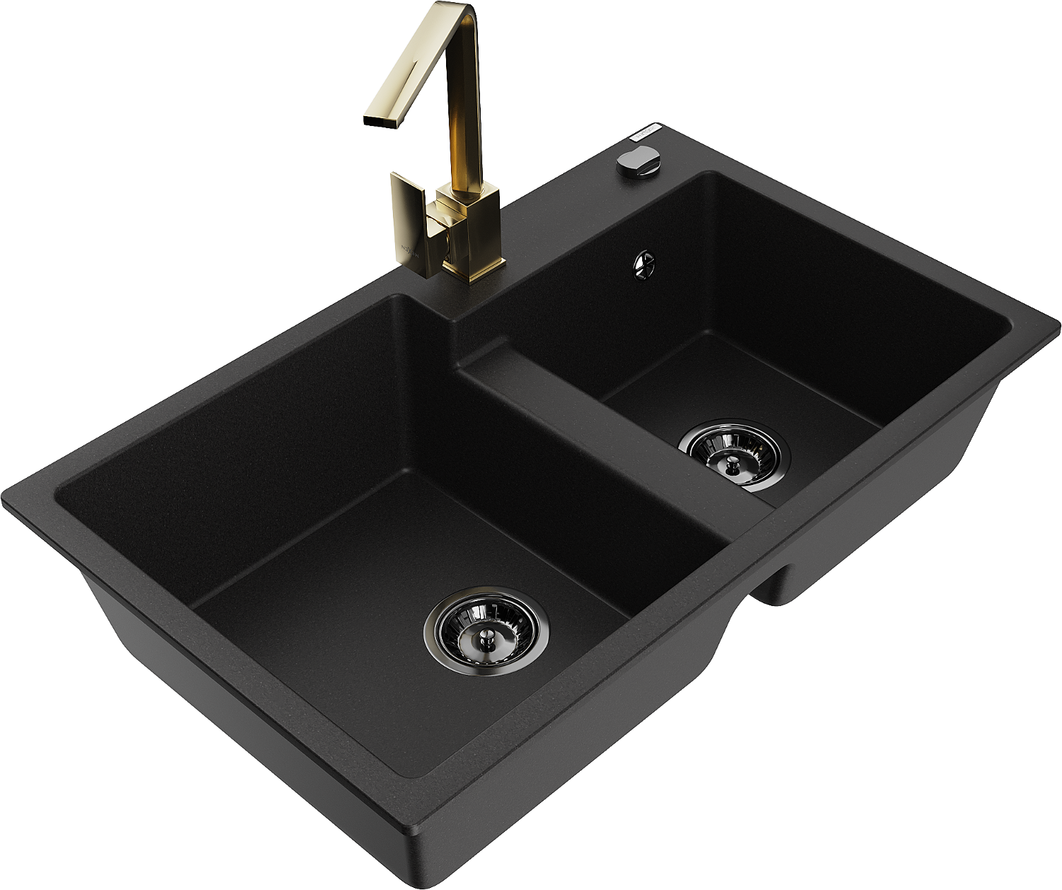 Mexen Tomas гранитна кухненска мивка с две корита и кухненски смесител Rita, черен - 6516-77-670300-50-B
