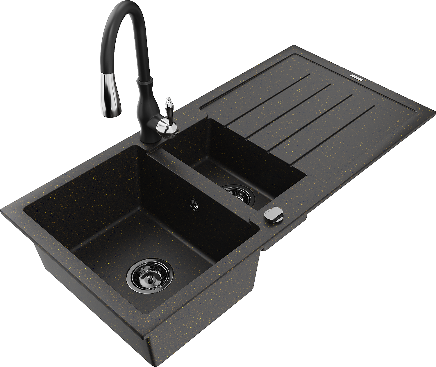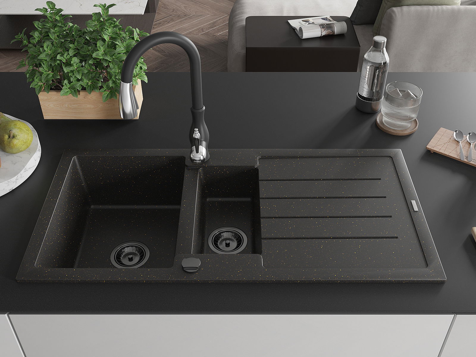 Mexen Andres гранитна мивка с 1,5 камери с draining board и кухненска батерия Savita, черен/златен - 6515-75-672601-70-B