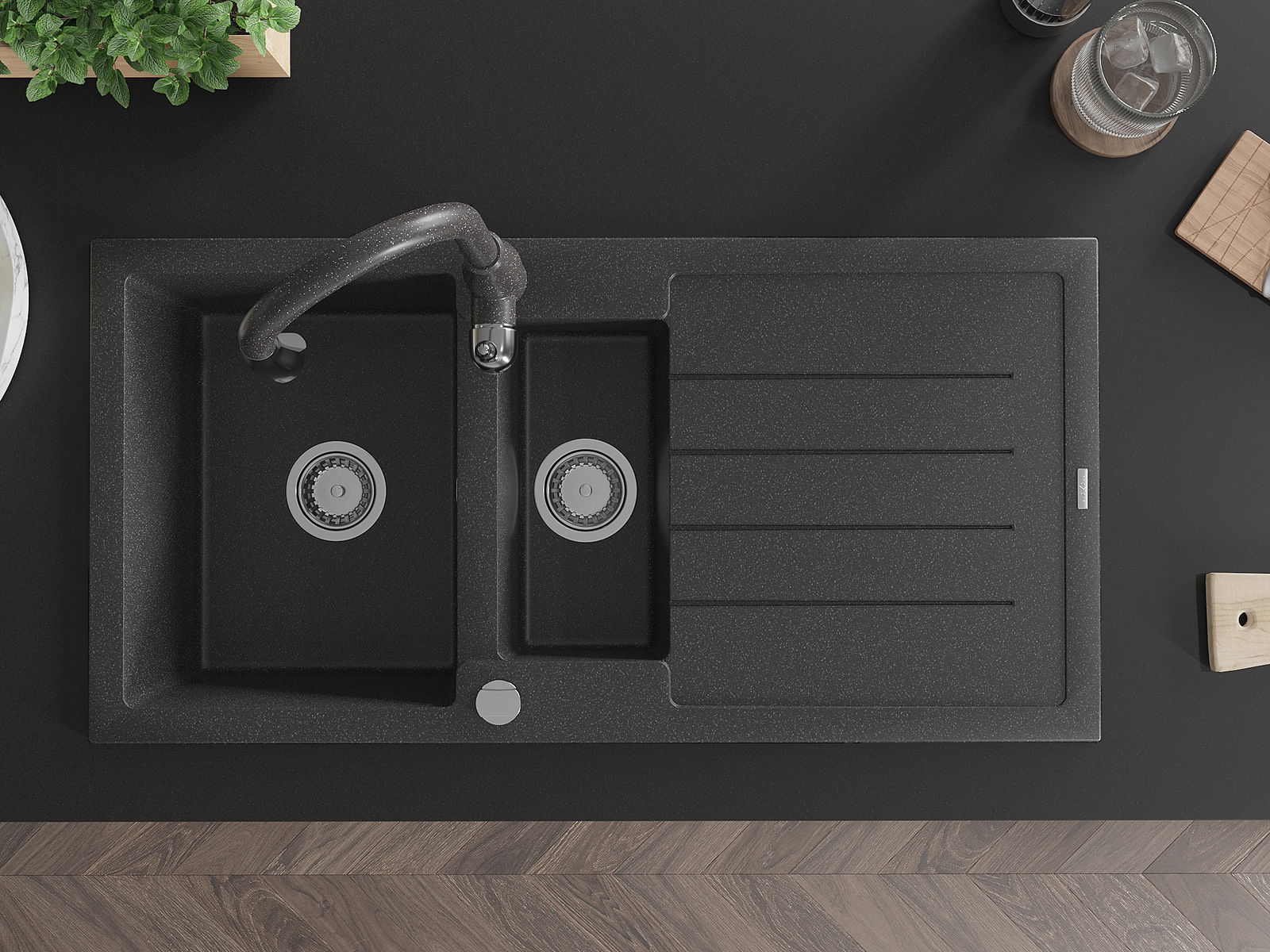 Mexen Andres гранитна мивка 1,5-камерна с отцеди и кухненски смесител Savita, черен на пръски - 6515-76-672601-76