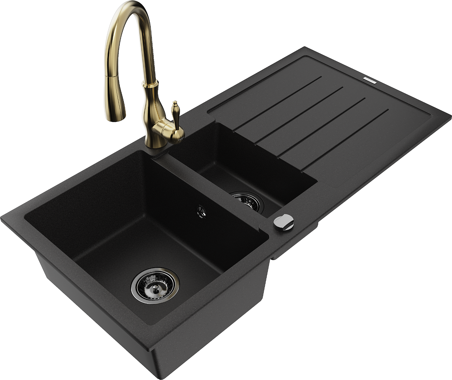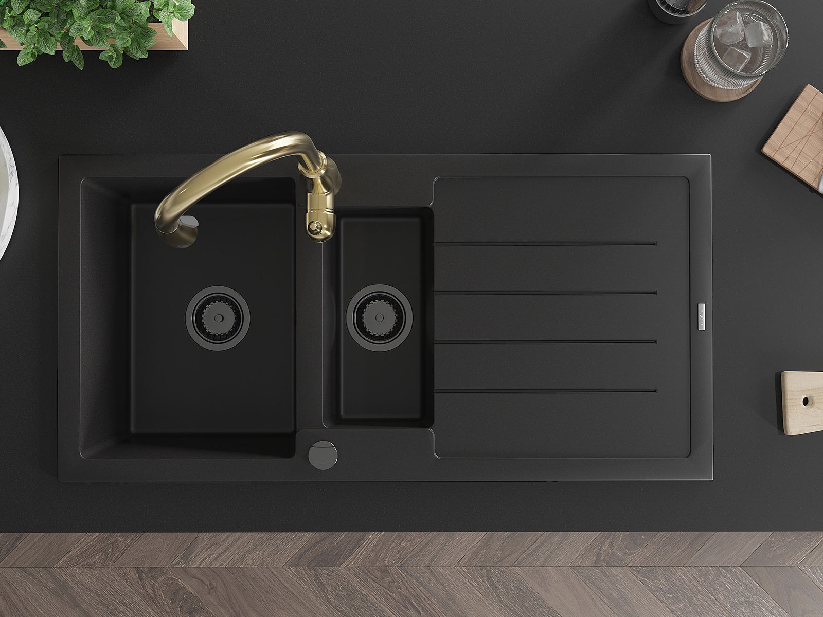 Mexen Andres гранитна мивка 1,5 камери с отцедник и кухненски смесител Savita, черен - 6515-77-672601-50-B