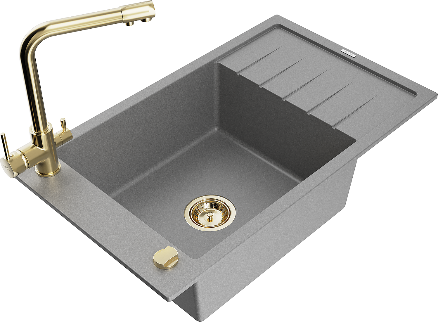 Mexen Elias единична кухненска мивка от гранит с отцедник и кухненски смесител Duero, сив - 6511-71-671600-50