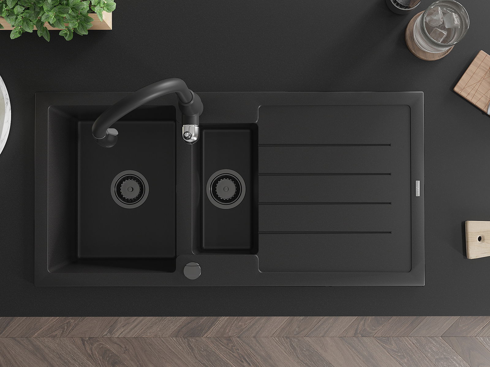 Mexen Andres гранитна мивка с 1,5 камери с отцедник и кухненски смесител Savita, черен - 6515-77-672601-70-B