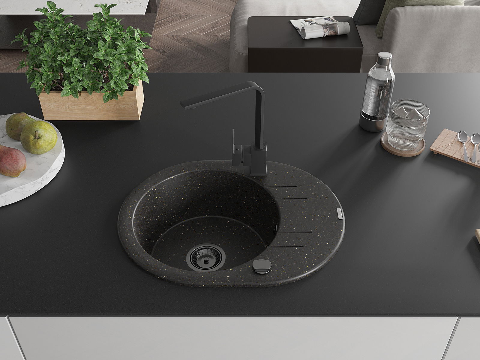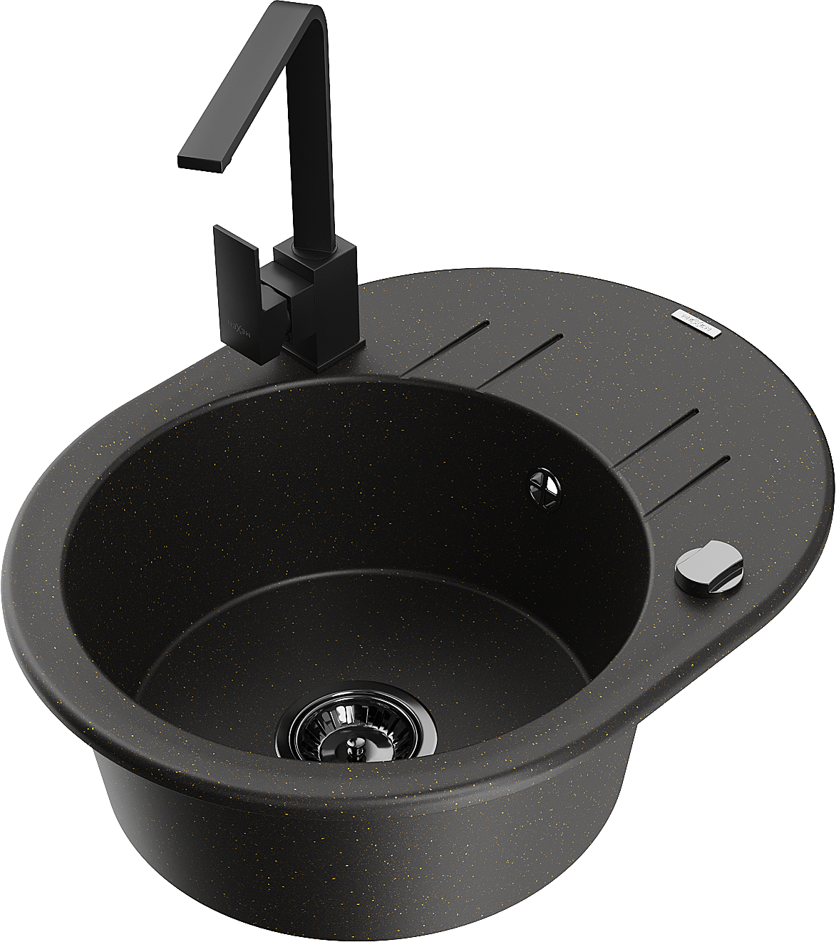 Mexen Kevin еднокамерен гранитен мивка с отцедник и кухненски смесител Rita, черен/златен металик - 6517-75-670300-70-B