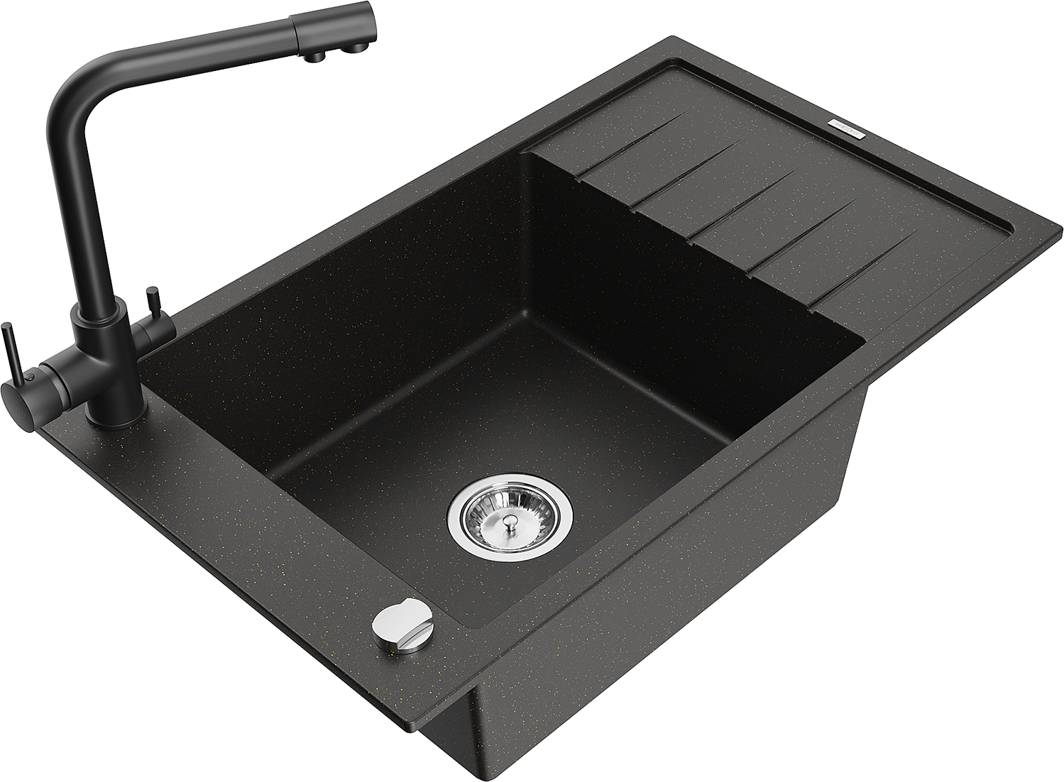 Мексен Елиас гранитна мивка с една камера с отцедник и кухненски смесител Дуеро, черен/златен металик - 6511-75-671600-70