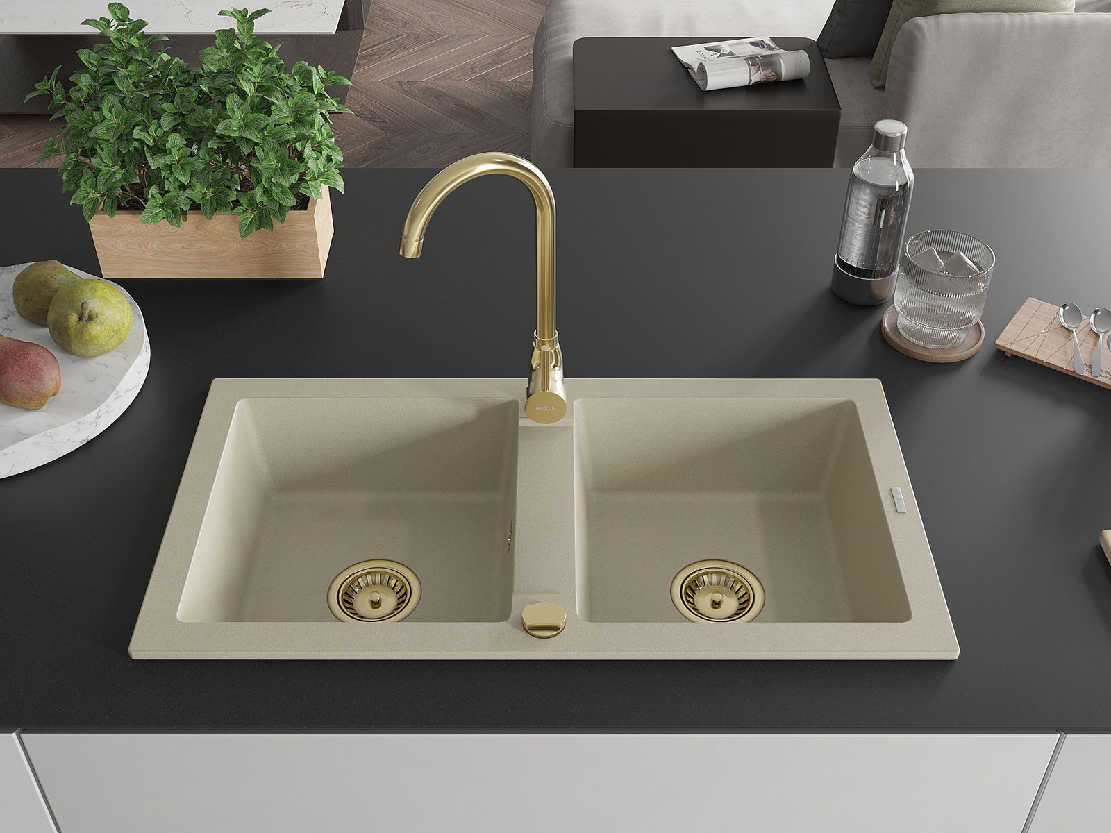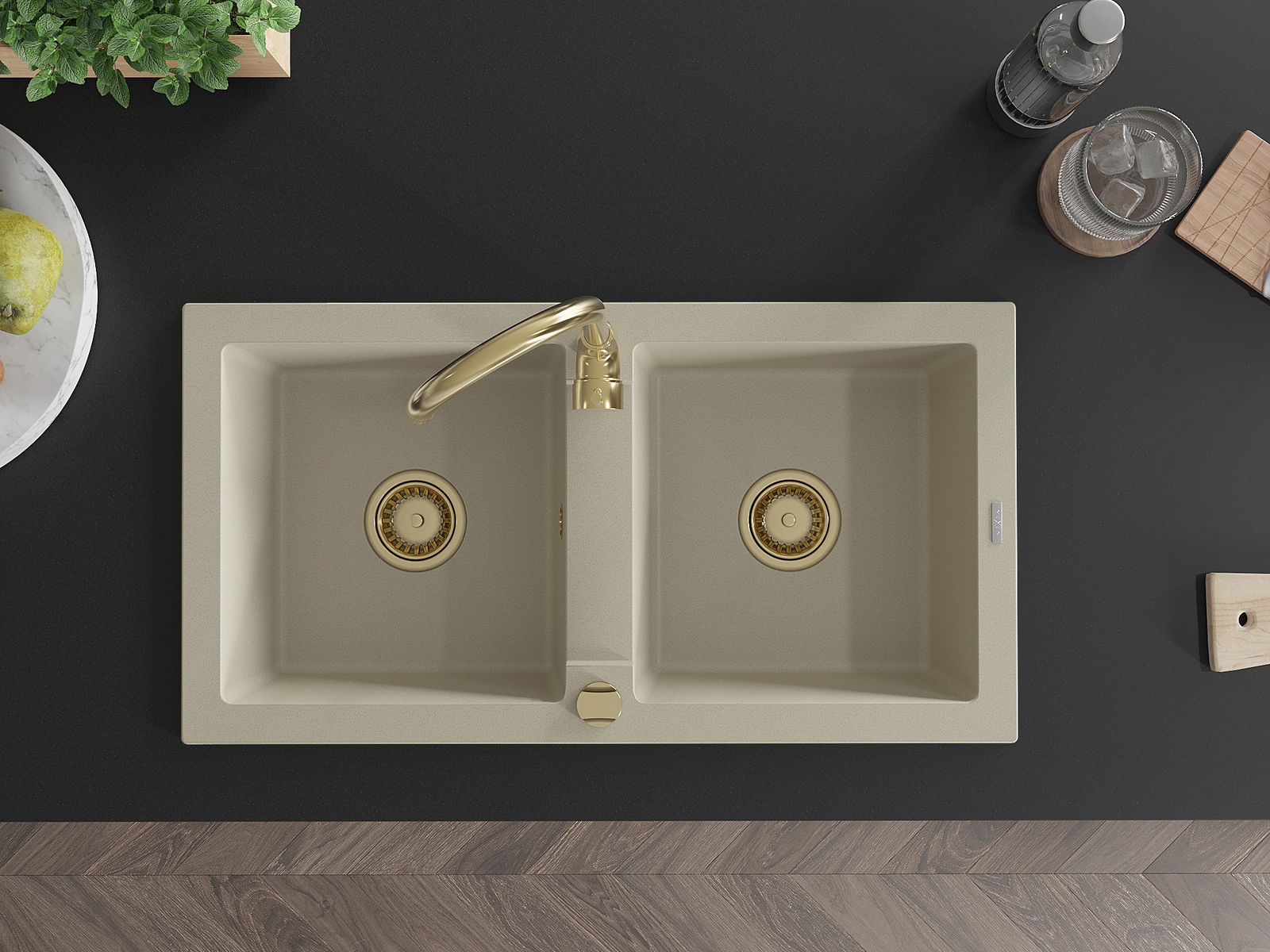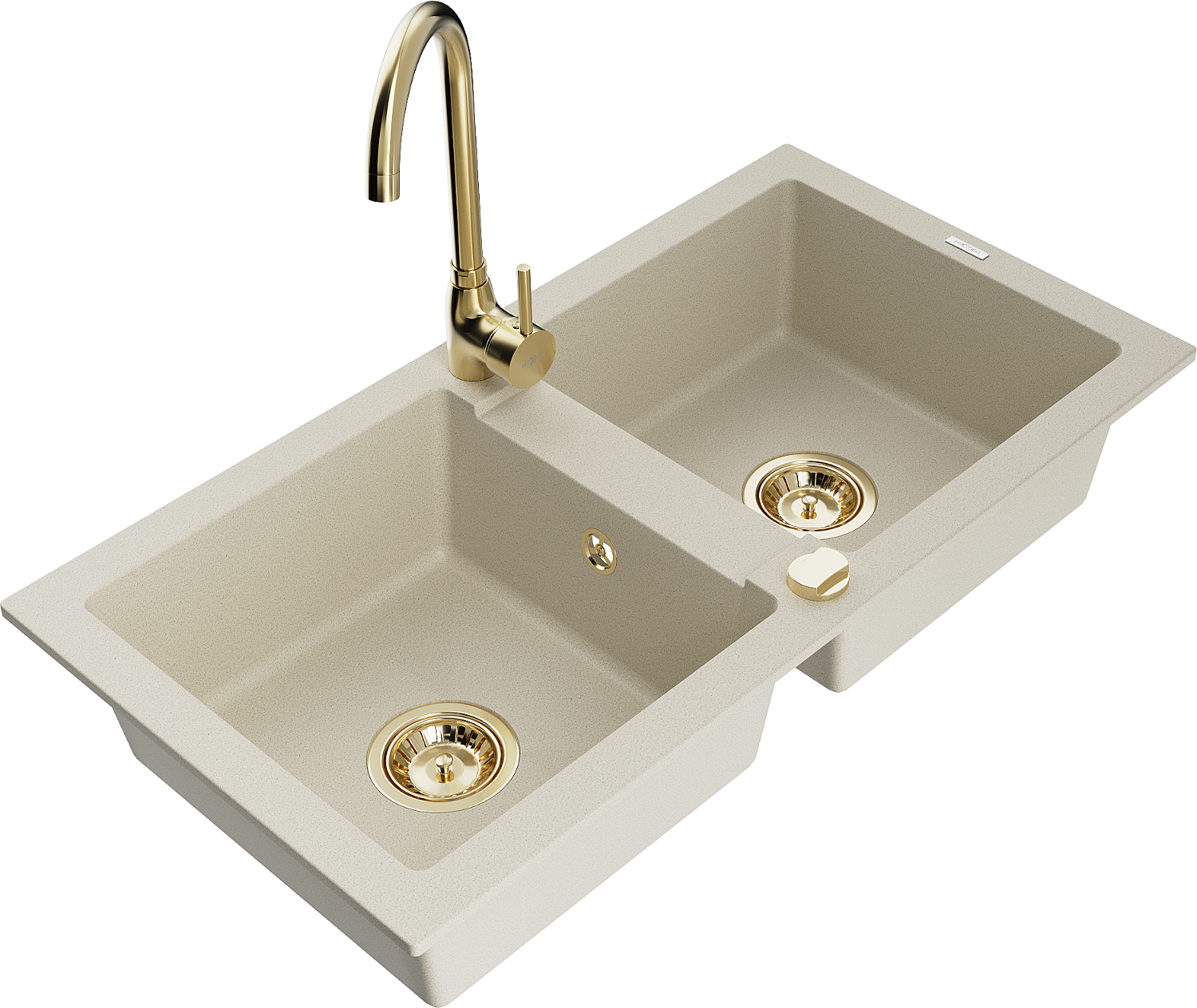 Mexen Mario гранитна мивка с две камери с кухненски смесител Telma, бежов - 6504-69-670200-50