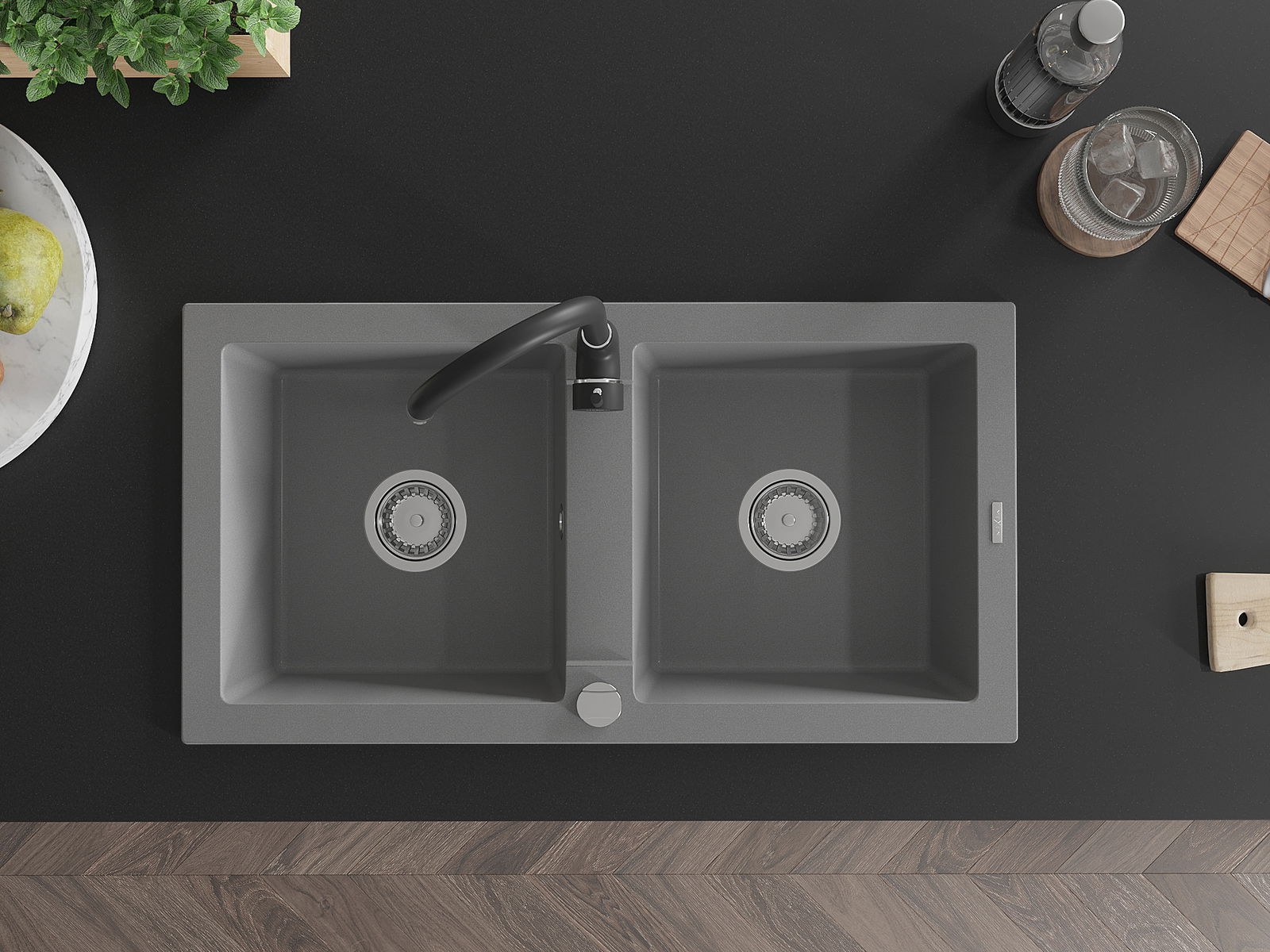 Mexen Mario гранитна мивка с 2 отделения с кухненски смесител Telma, сив - 6504-71-670200-70