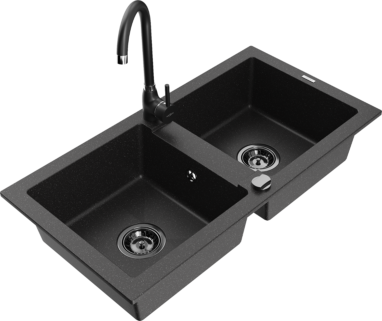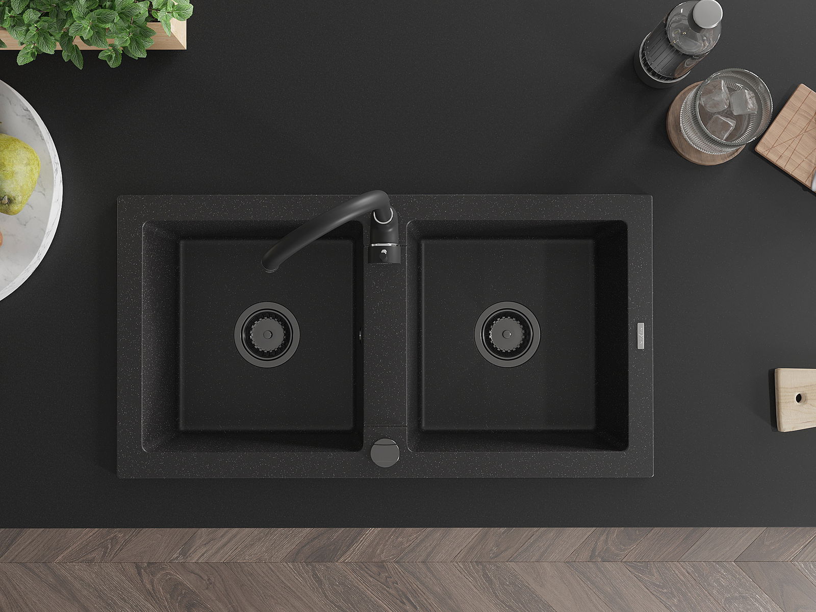 Mexen Mario гранитна мивка с 2 камери и кухненски смесител Telma, черен/сребърен - 6504-73-670200-70-B