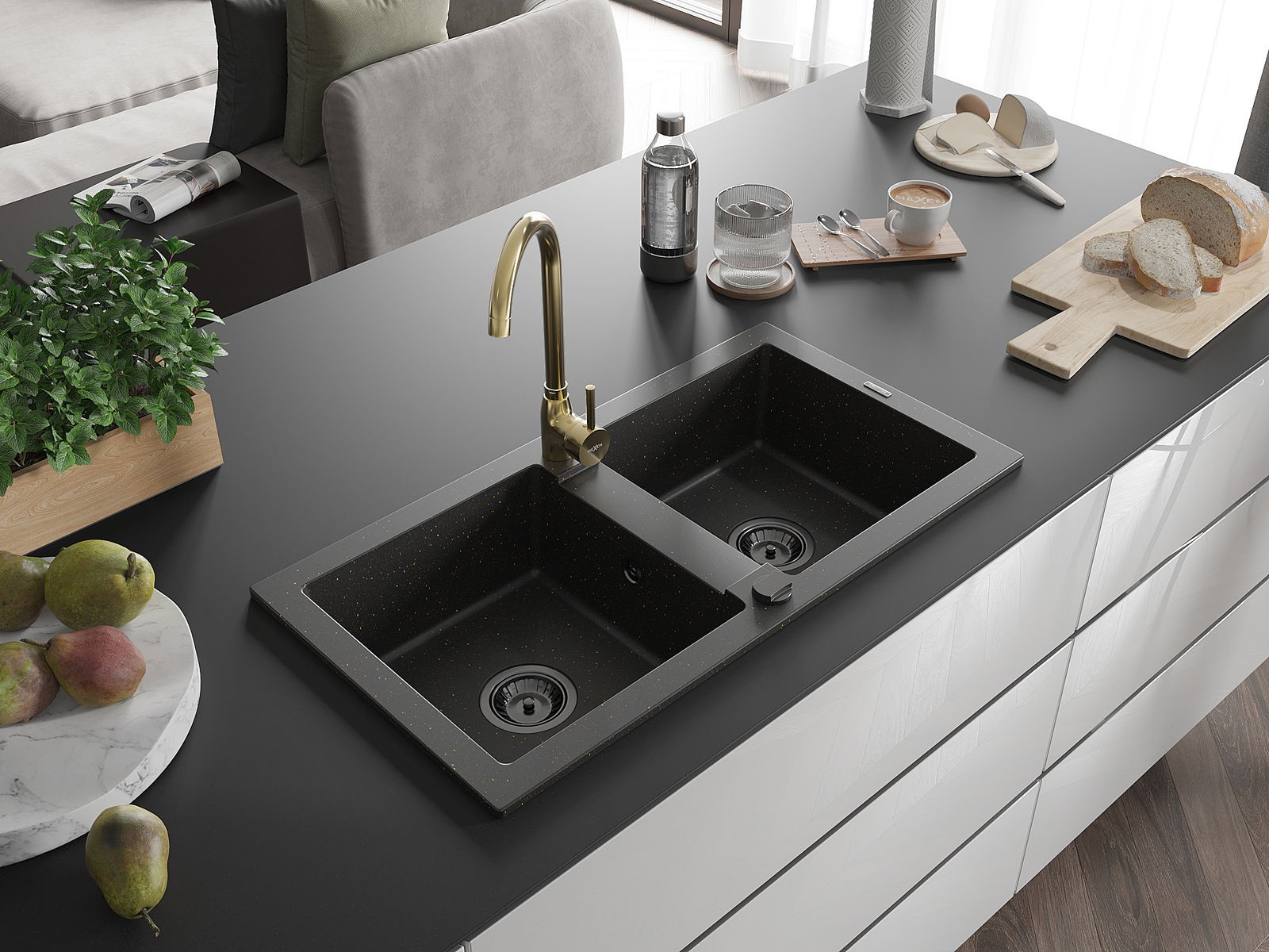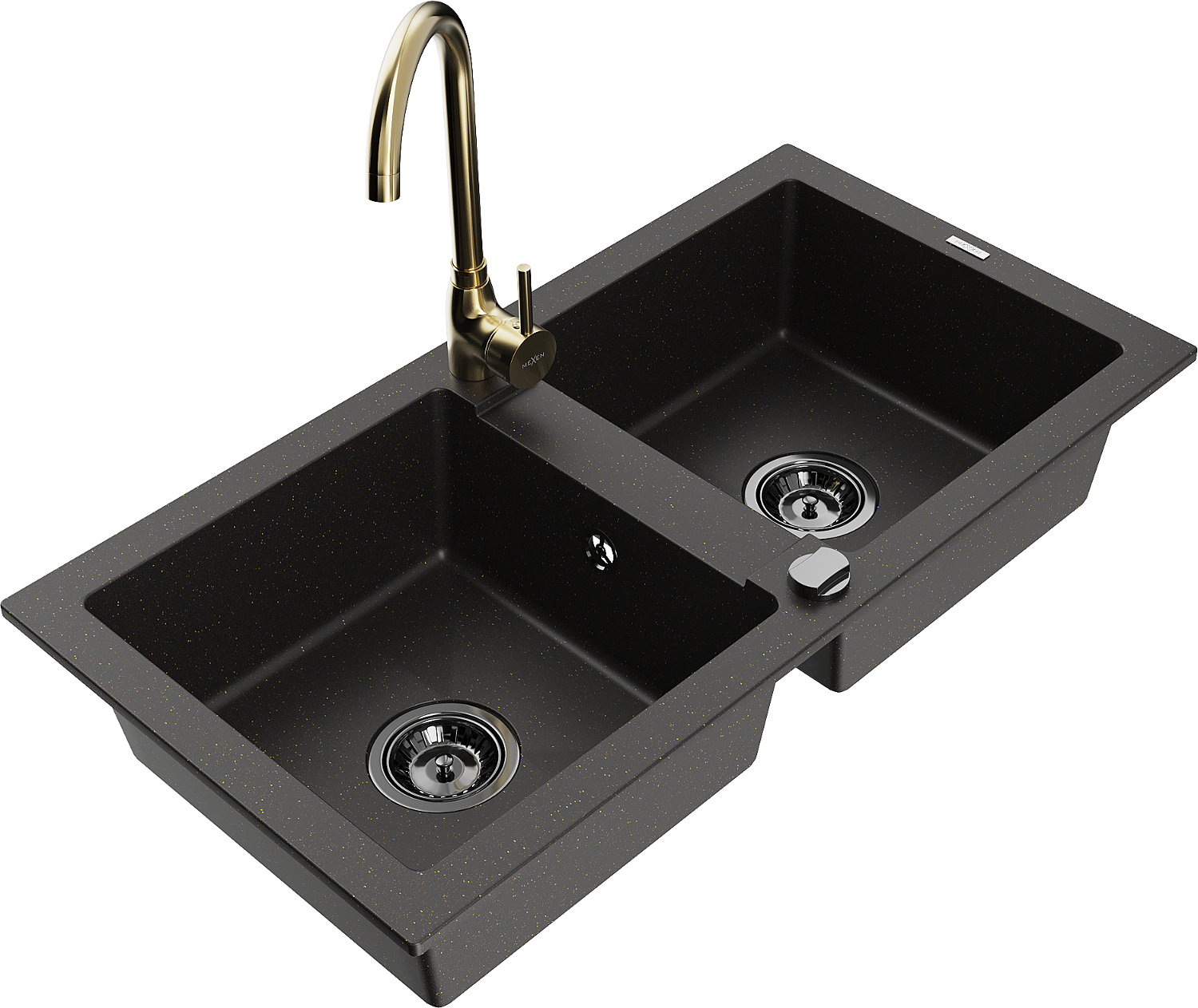 Mexen Mario двоен кухненски гранитен мивка с кухненски смесител Telma, черен/златен - 6504-75-670200-50-B