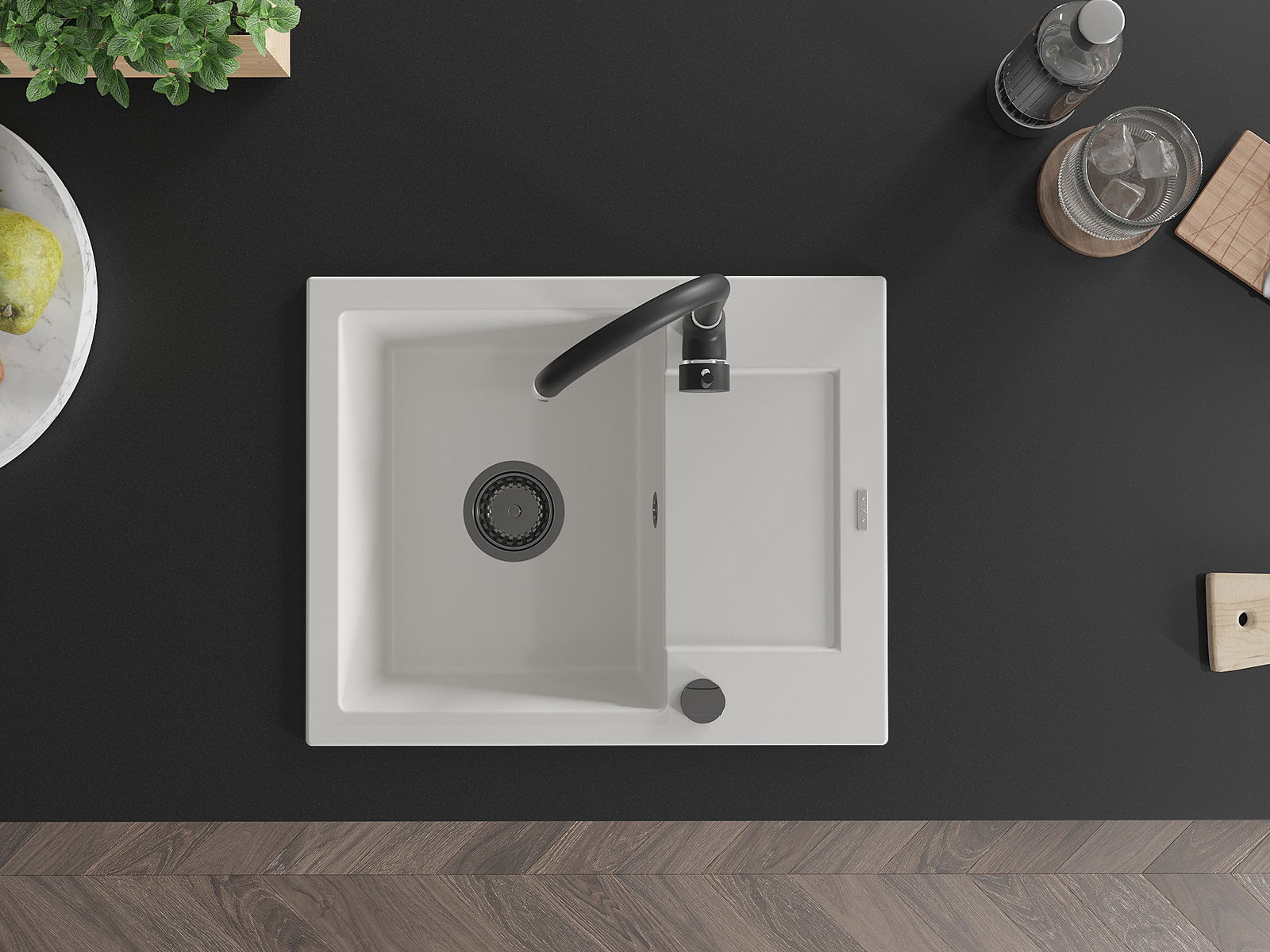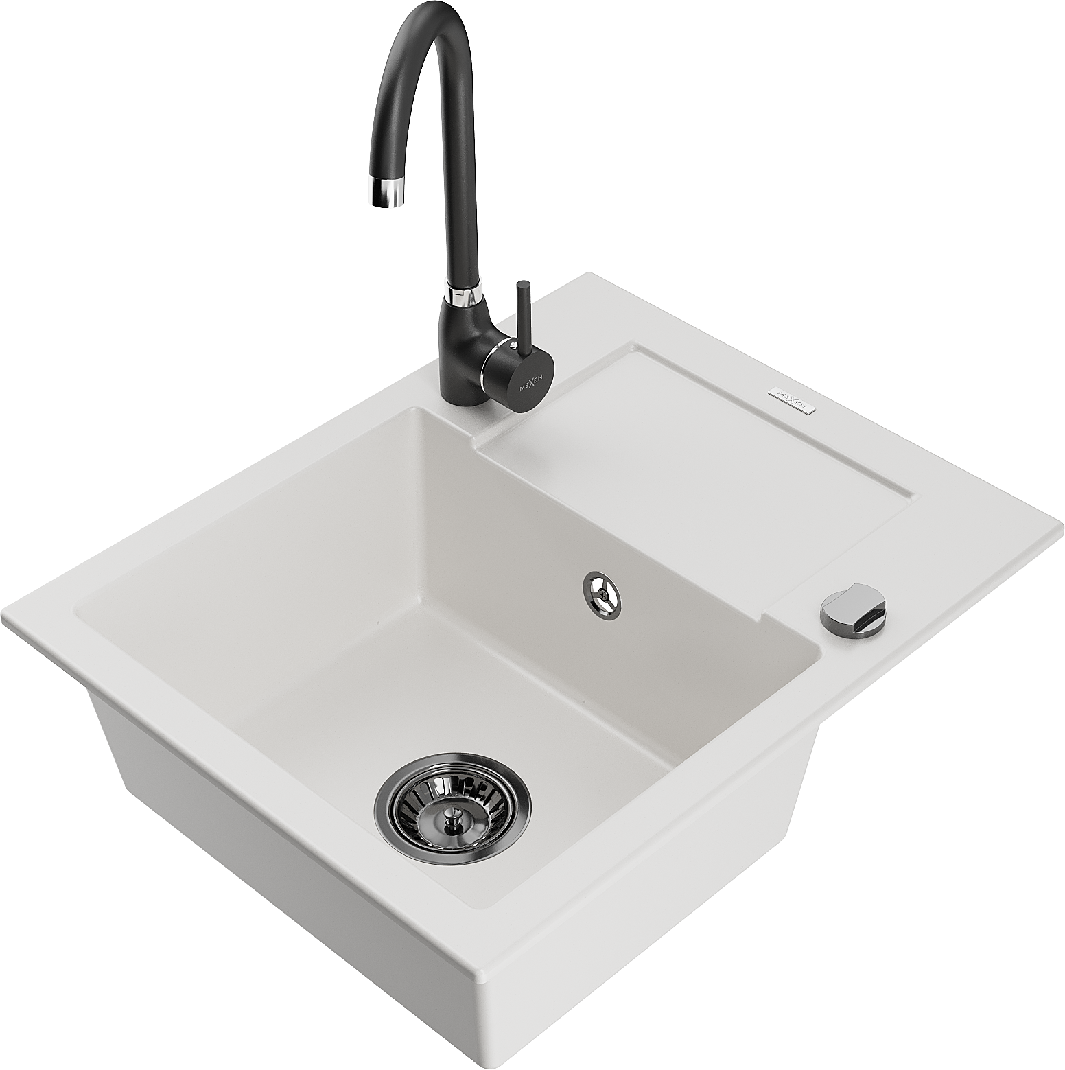 Mexen Enzo еднокамерен гранитен кухненски мивка с отцедник и кухненски смесител Telma, бял - 6506-20-670200-70