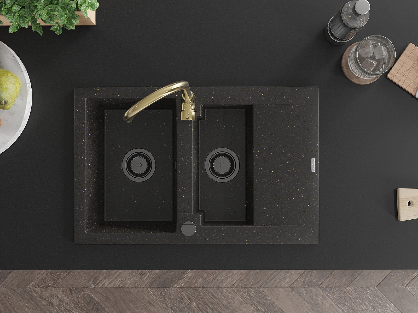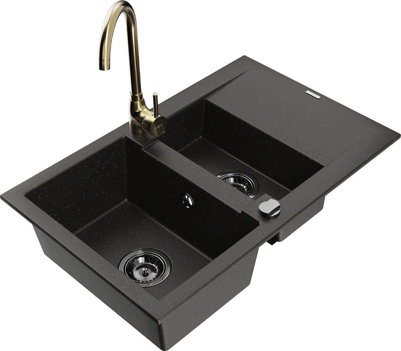 Гранитна мивка Mexen Gaspar с 1,5 камери с отцедник и кухненски смесител Telma, черен/златен - 6507-75-670200-50-B