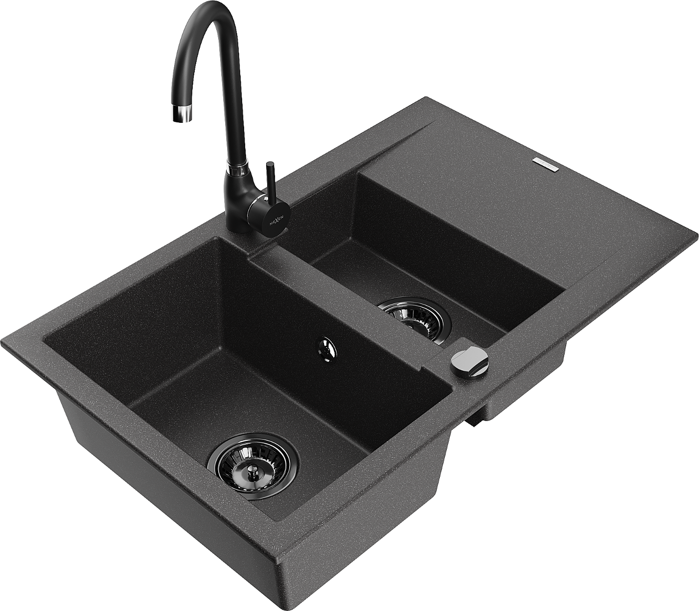Mexen Gaspar гранитна мивка 1,5-камерна със сушилник и кухненски смесител Telma, черен на пръски - 6507-76-670200-70-B