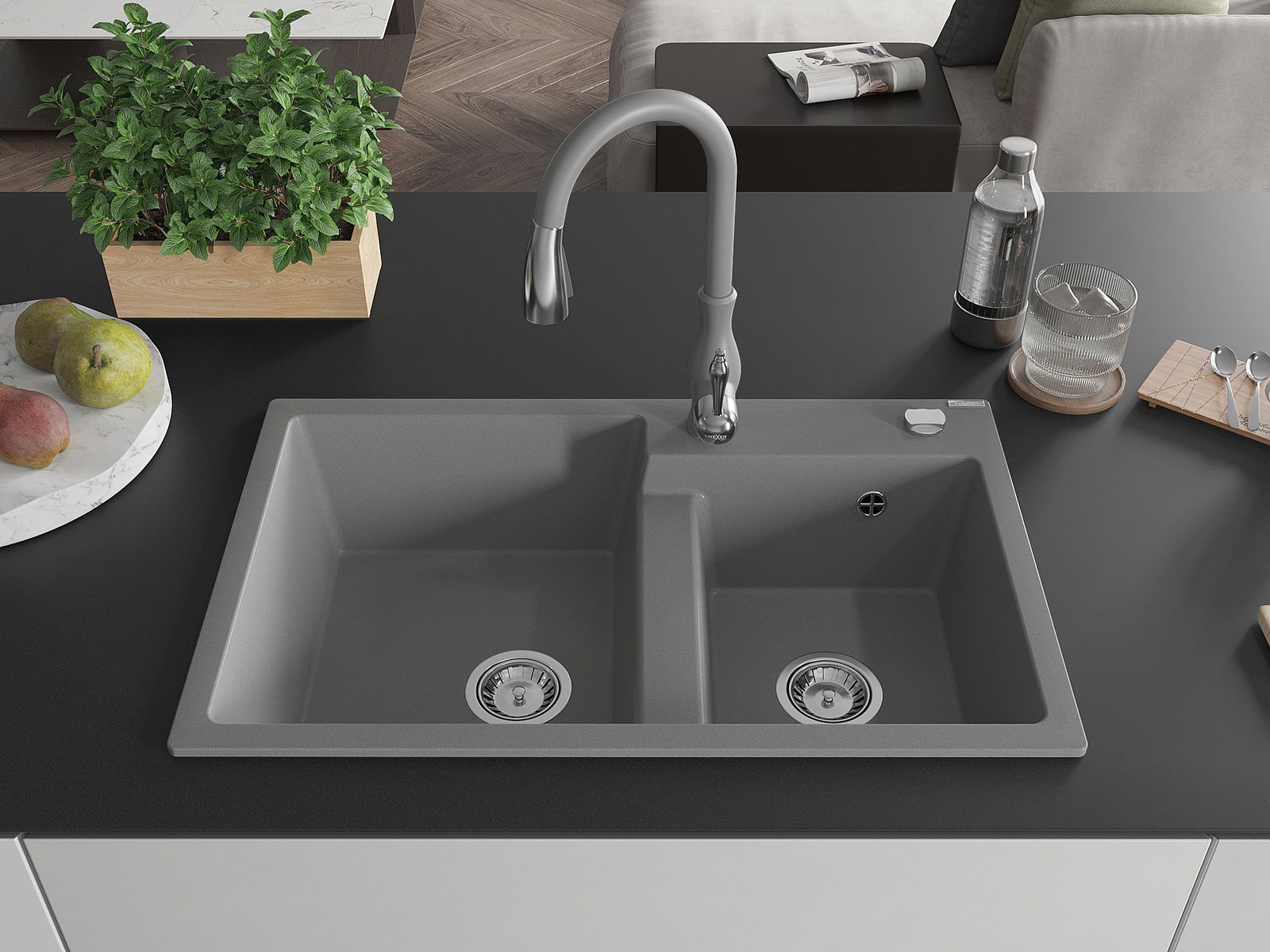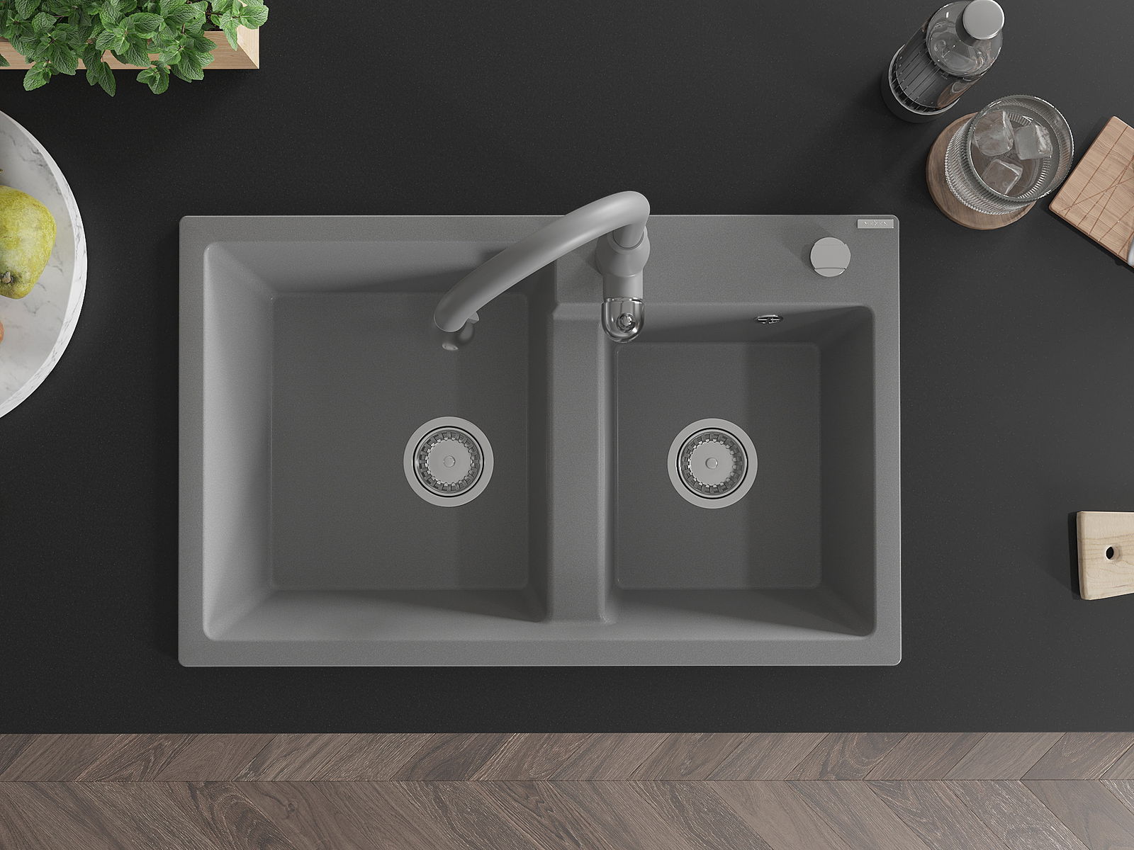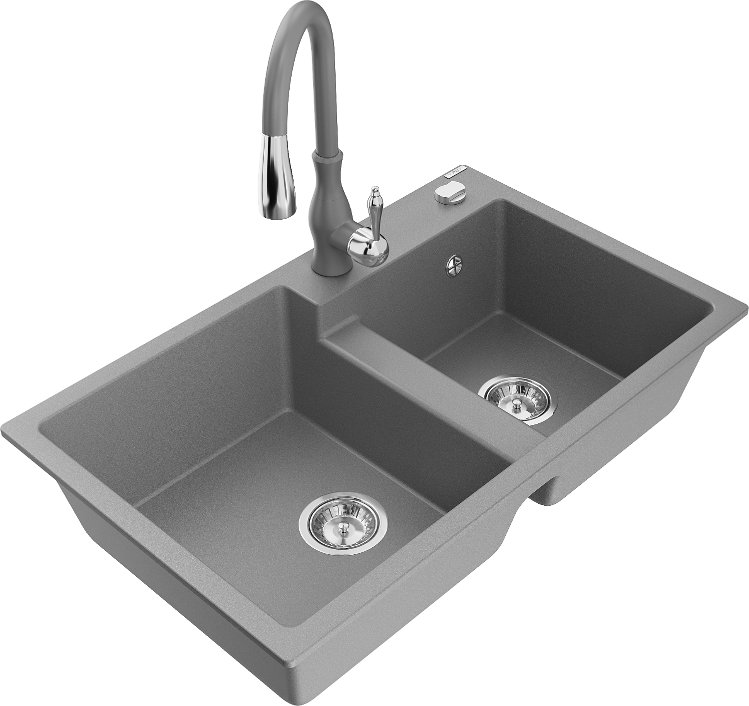 Mexen Tomas гранитна мивка с 2 гнезда с кухненски смесител Savita, сив - 6516-71-672601-71