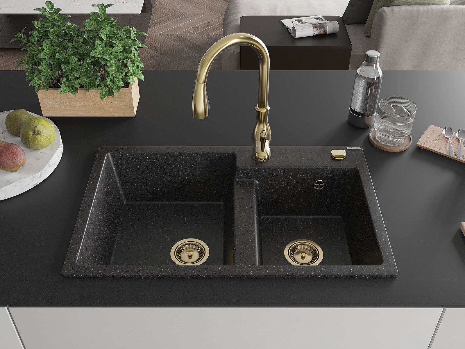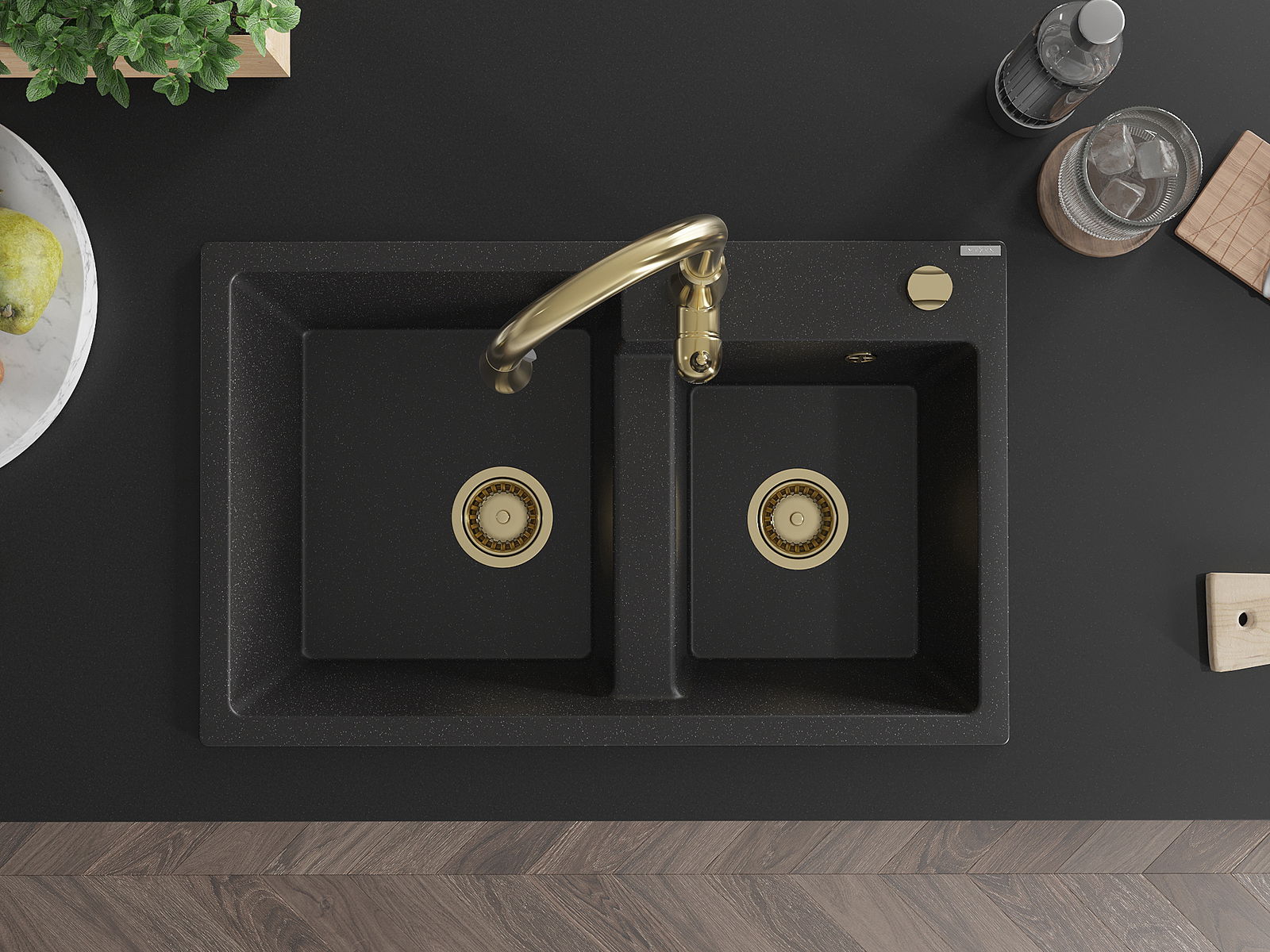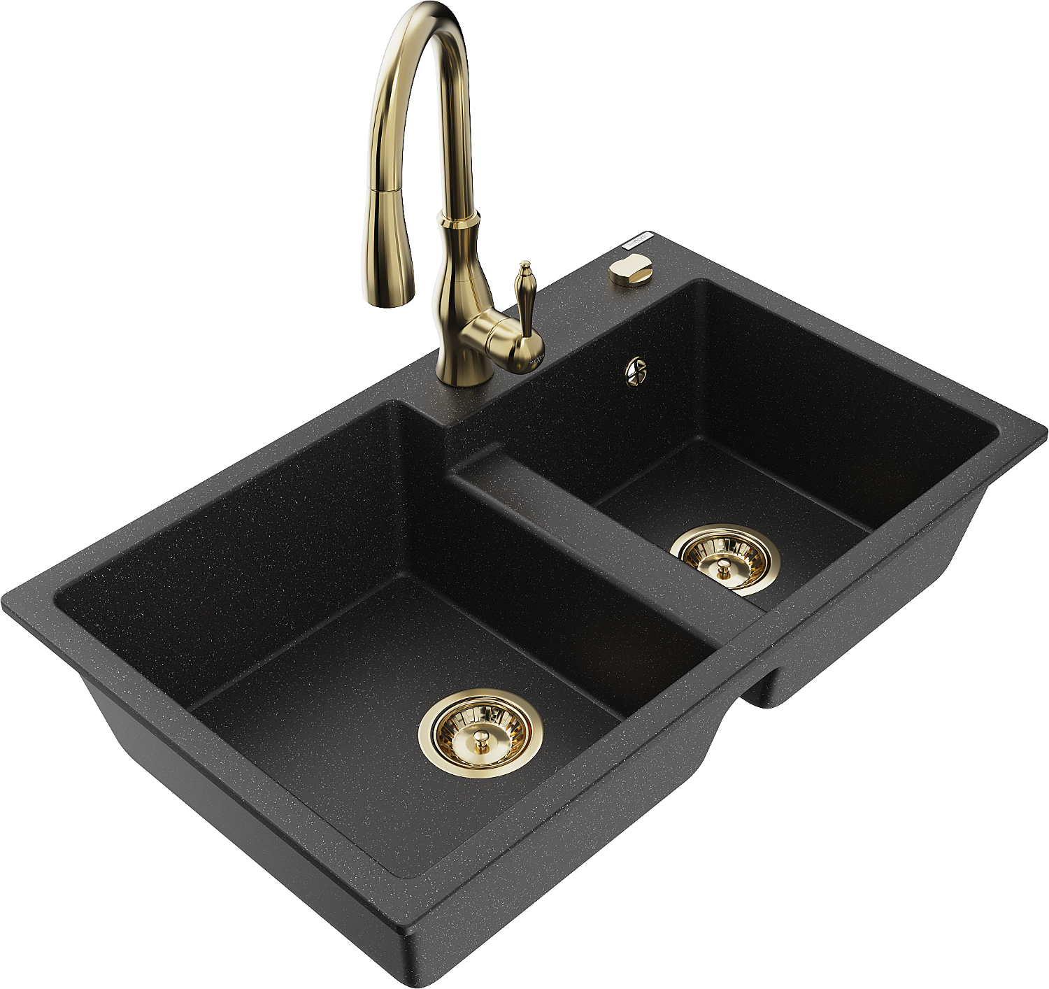 Mexen Tomas гранитна мивка с 2 камери с кухненски смесител Savita, черен/сребрист металик - 6516-73-672601-50